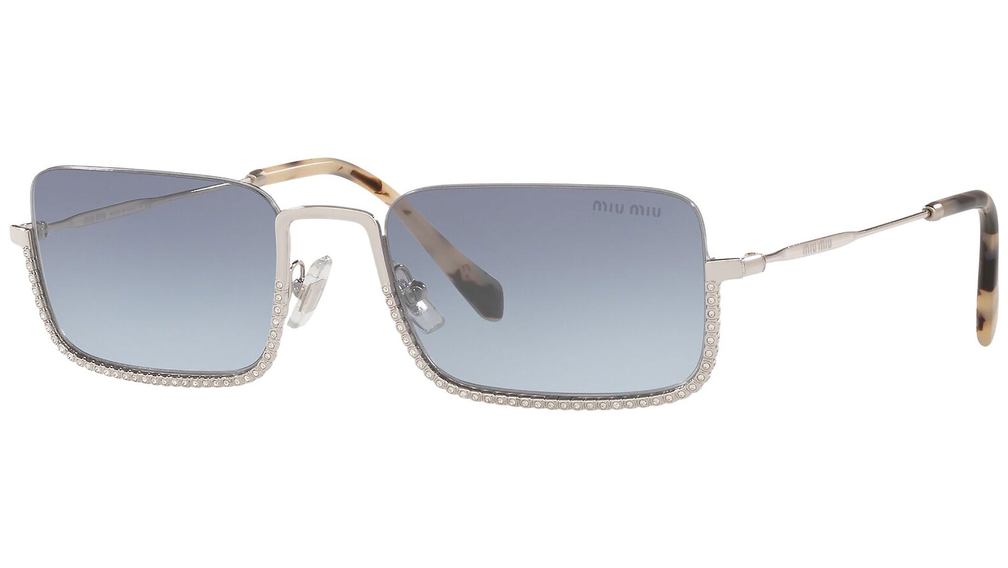 Miu Miu solbriller model MU 70US sølv stel variant, farvekode 1BC4R2 med blå gradient linse. Solbrillerne fra Miu Miu brillekollektion er unikke kreationer, resultatet af den konstante stilistiske forskning og dygtige håndværk af mærket. En unik blanding af legende eksperimenter og rige detaljer, der perfekt inkarnerer de stilistiske koder, der altid har kendetegnet huset, hvilket igen bekræfter Miu Mius ubestridte talent i at kombinere ukonventionelle designs med retro-inspireret romantik.