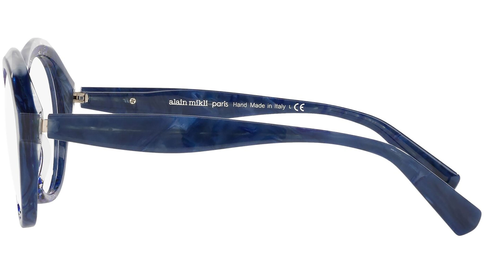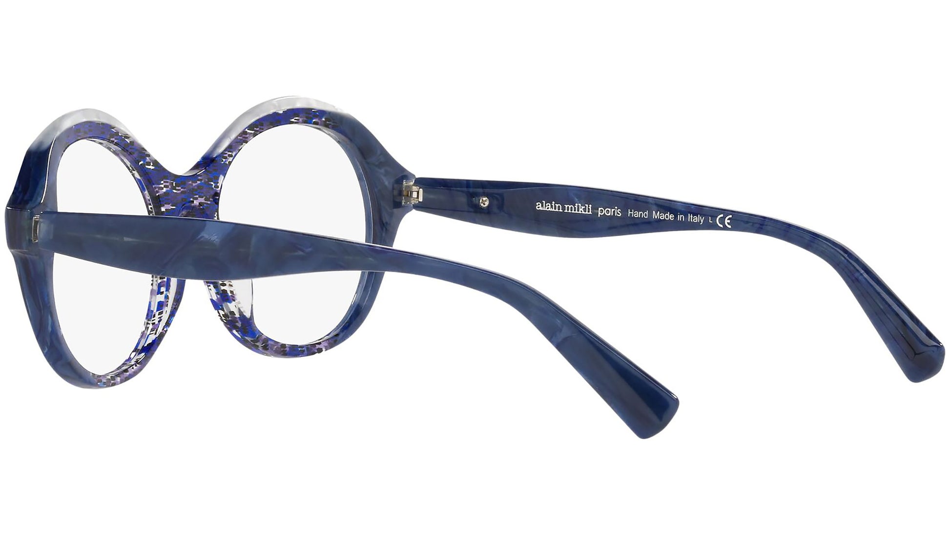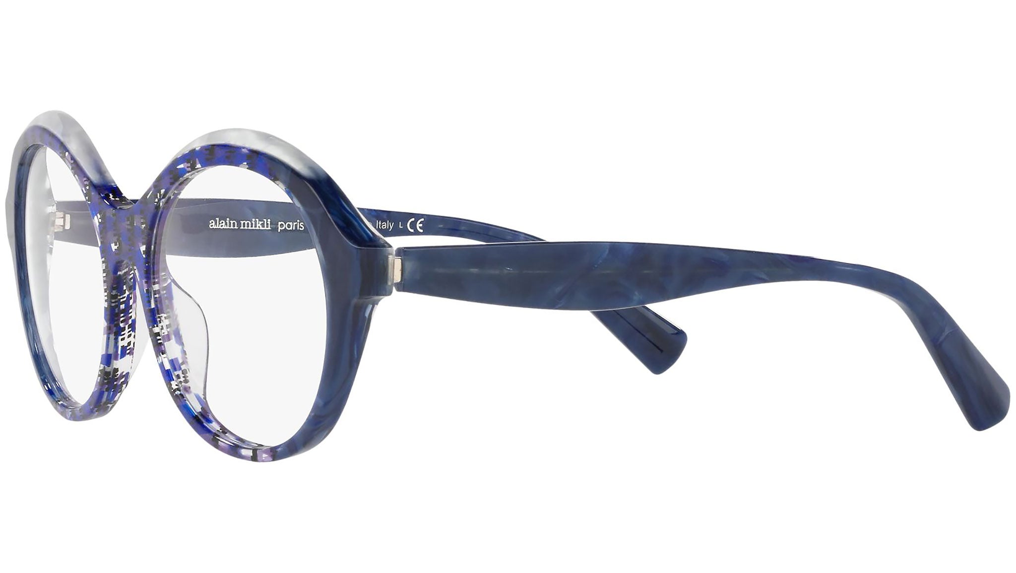 Alan Mikly Eyewear Collection model A03118, blue fishnet / blanc / blue frame variant, color code 001. Alain Mikli is known for pioneering eyewear as an accessory. The brand fuses art with fashion to create frames that are wearable yet distinctive and provocative – with unique design and exclusive color combinations.