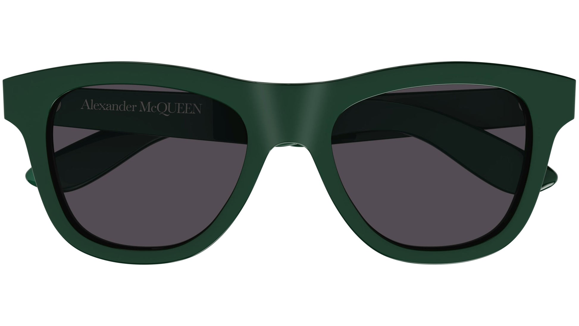 Alexander McQueen Casual Lines sunglasses model AM0421S rectangle recycled acetate frame color code 004 shiny solid green with green temple and solid grey lens.