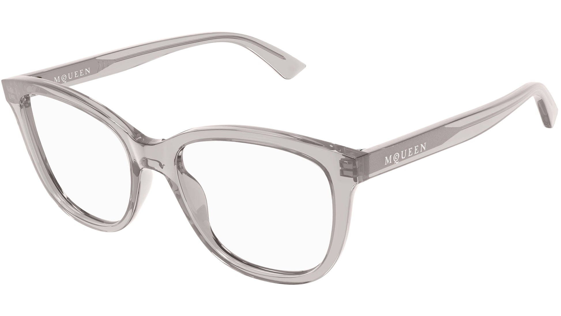 Alexander McQueen eyewear Casual Lines line model AM0487O, cat eye recycled acetate glasses color code 003 shiny transparent taupe with grey temple and demo lens. Authorized Alexander McQueen online reseller. Your glasses will come with the original case and accessories and will be covered by a 12-month global warranty.