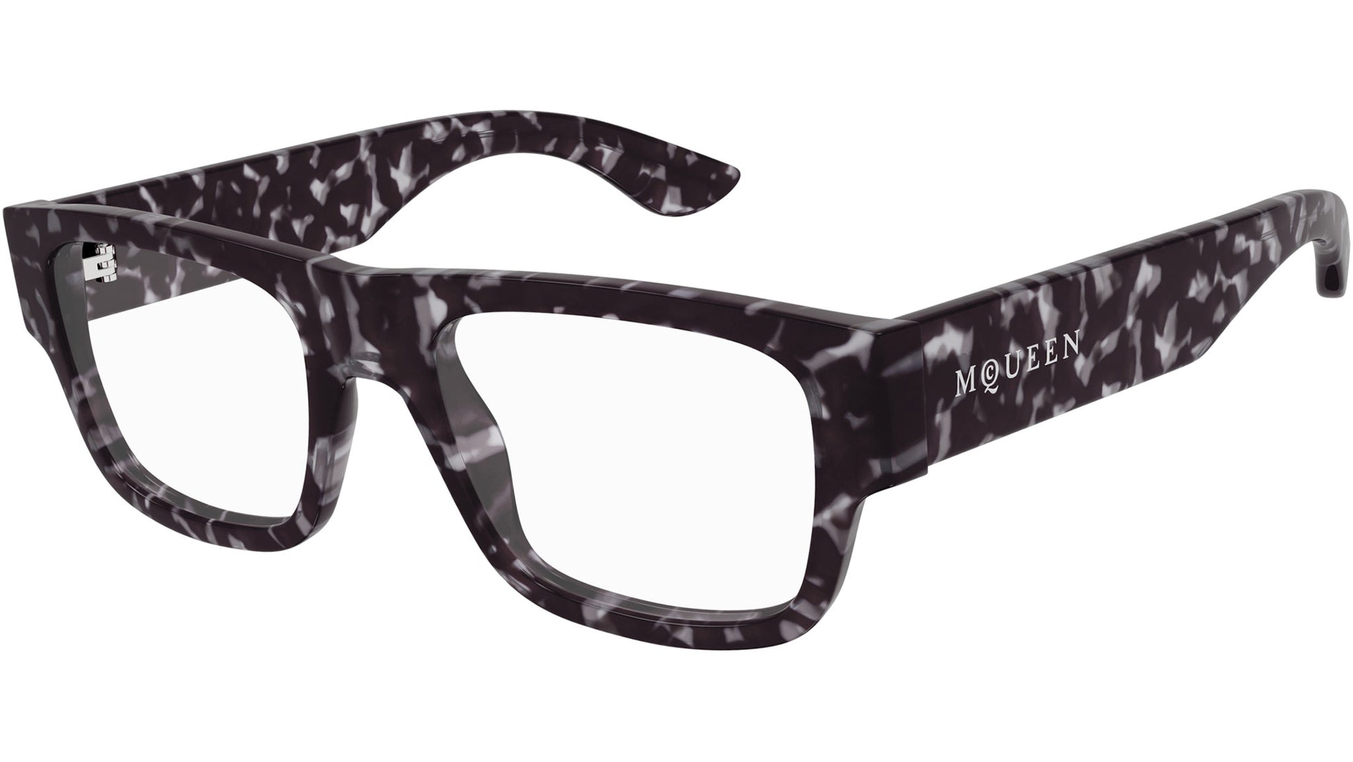 Alexander McQueen Logo line glasses model AM0511O for men. Rectangle recycled acetate frame shape. Color code 002 featuring shiny grey dark havana front with havana temple and demo lenses. Authorized Alexander McQueen online reseller. Your glasses will come with the original case and accessories and will be covered by a 12-month global warranty.