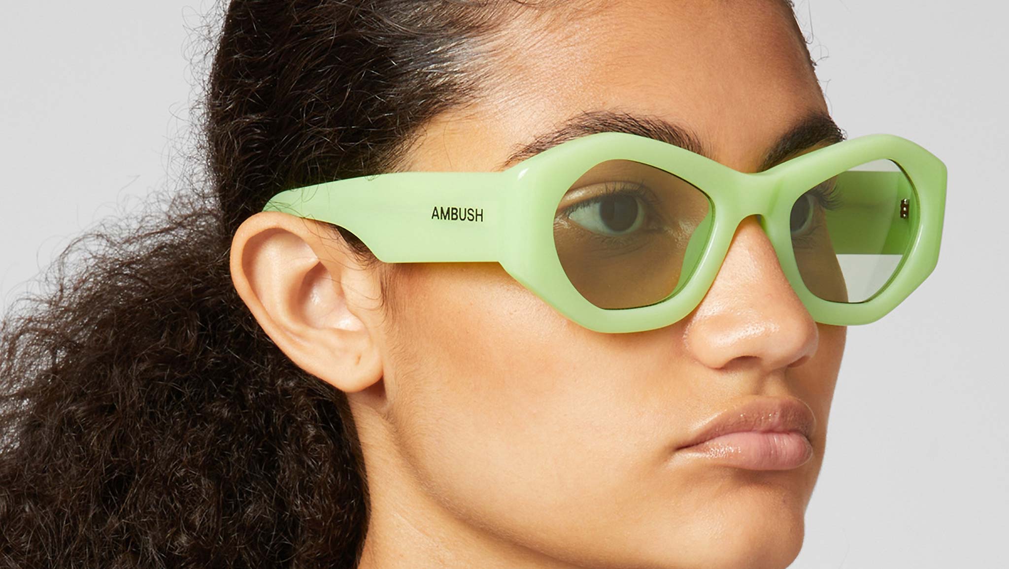 The SS23 sunglasses are Made in Italy and are realized entirely in acetate; they showcase bold geometric shapes inspired by the punk 2000s which are being reinterpreted in the collection in a contemporary way. All the styles are unisex and perfectly respond to the ready-to-wear collection in terms of design and color propositions. The logo is 3D embossed and adorns the temples as a dainty “A” or as the full Ambush lettering or lastly, it can be found on the end tips as a metallic luxurious addition.