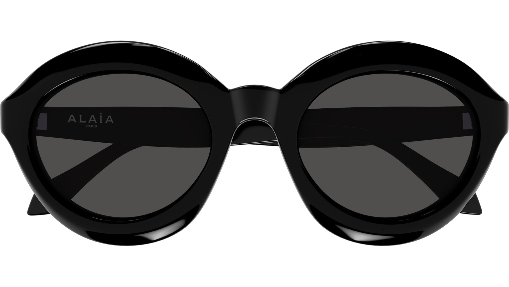 Azzedine Alaïa AA0088S 001 sunglasses for women, featuring shiny solid black panthos recycled acetate frame and solid smoke CR-39 lenses. Brand line: Lettering Logo. Style code: AA0088S. Color code: 001. Made in Italy. Authorized Alaïa online reseller. Your glasses will include the original case and accessories and are covered by a 12-month global warranty.