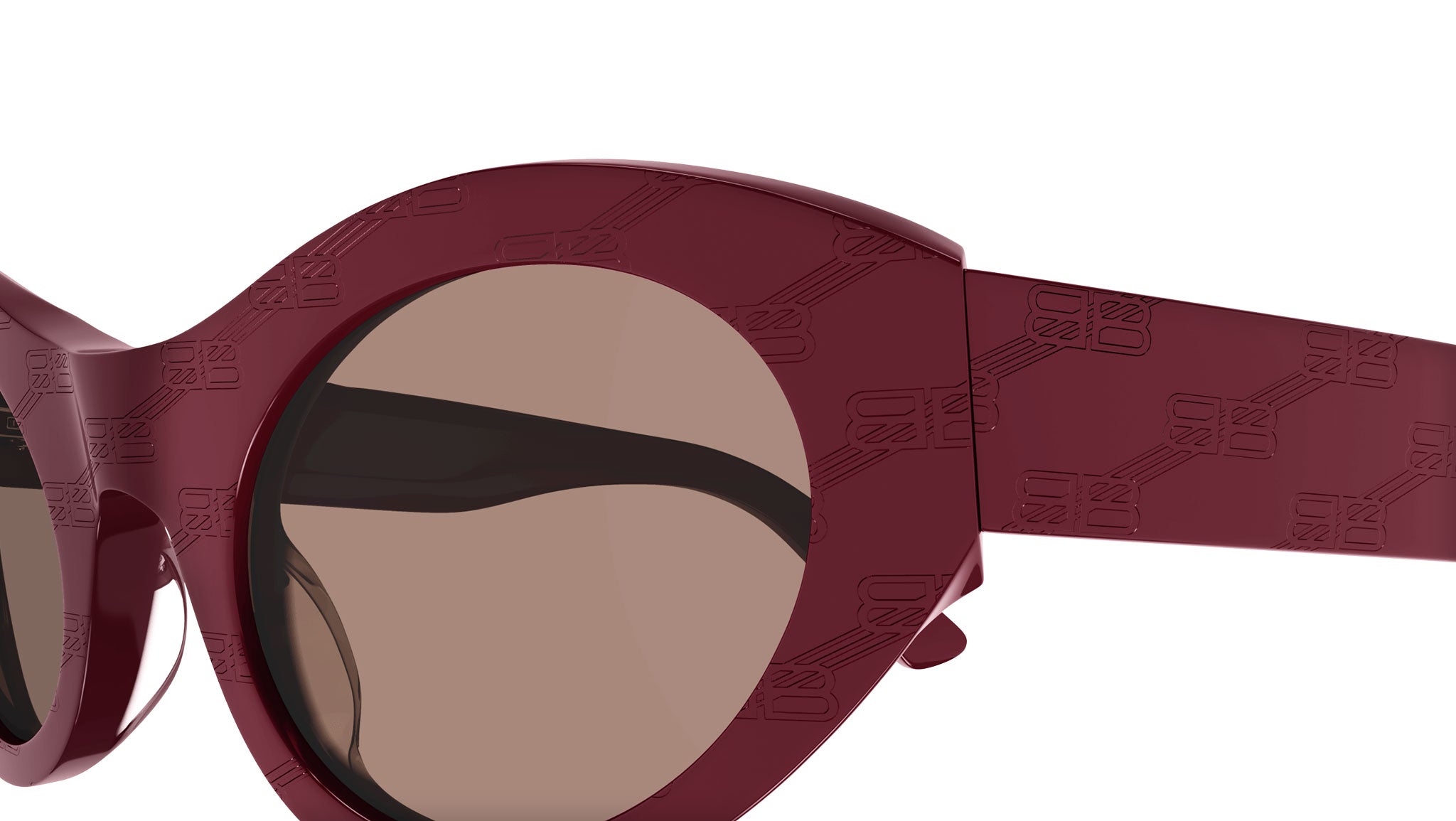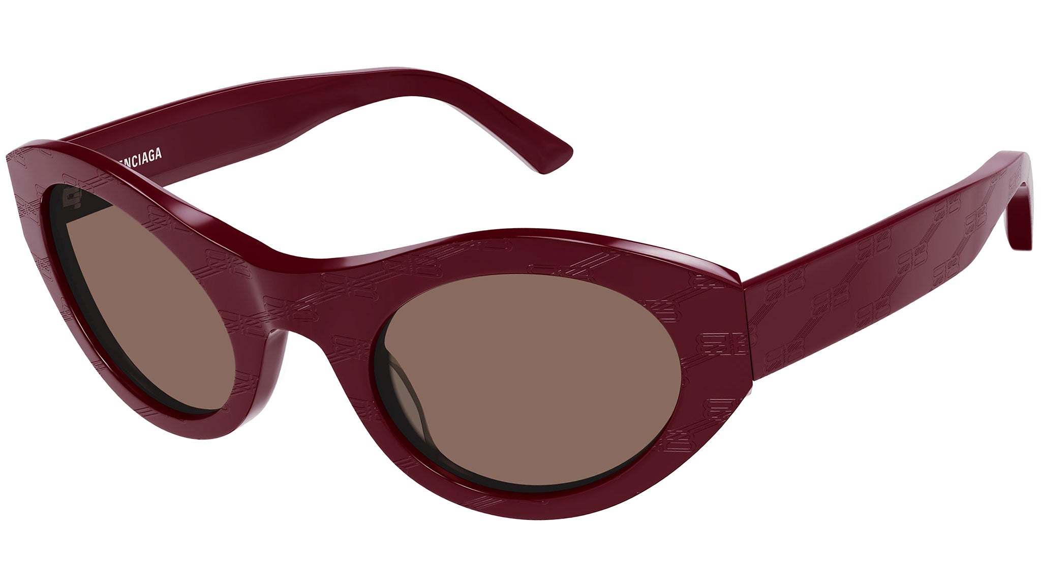 Balenciaga Extreme collection sunglasses model BB0250S 004 featuring shiny solid burgundy with all over logo frame and solid warm brown lens.