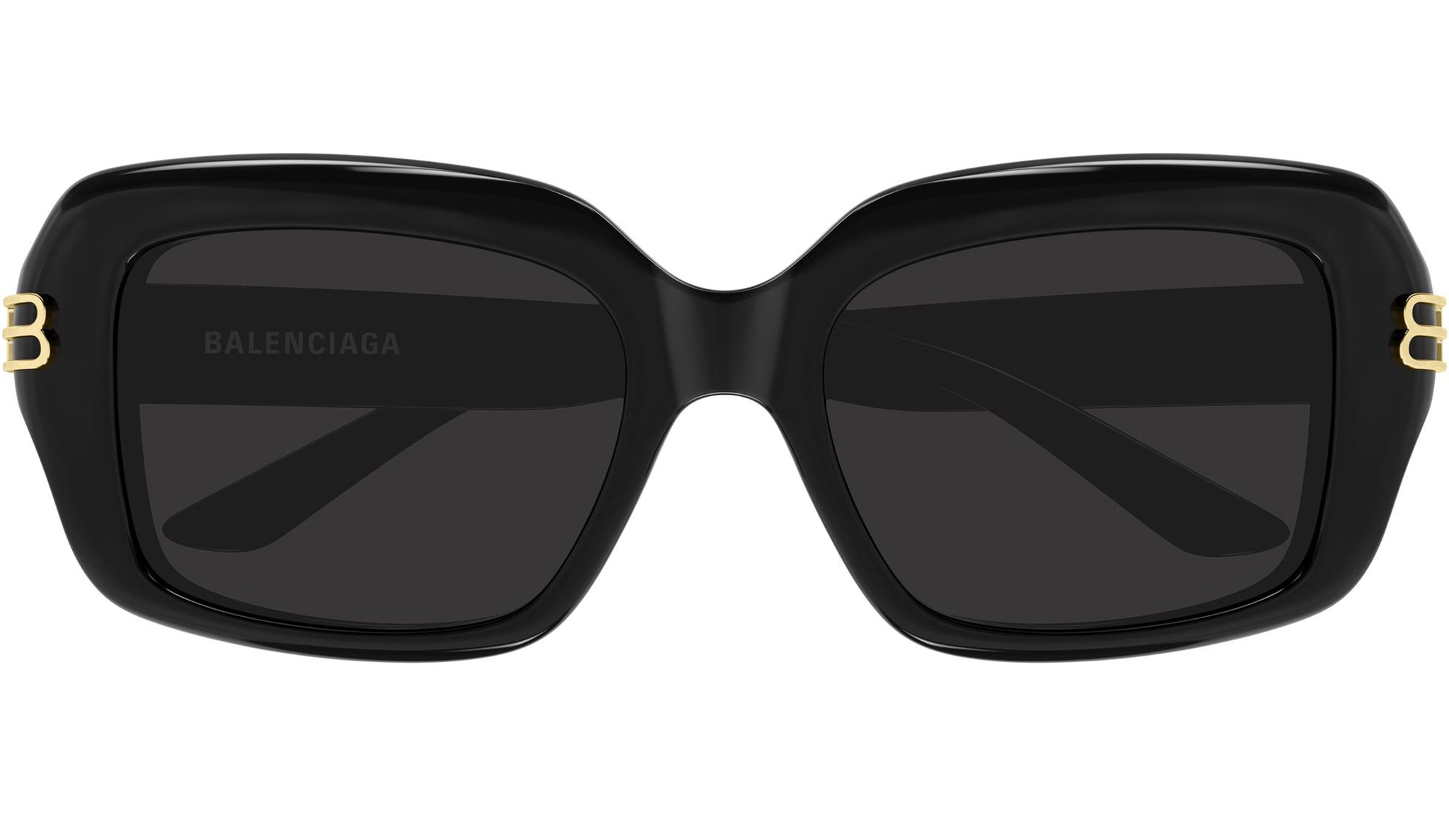 Balenciaga BB0465S 001 sunglasses for women, featuring shiny solid black rectangular recycled acetate frame and solid grey bio nylon lenses. Brand line: Everyday. Style code: BB0465S. Color code: 001. Made in Japan. Authorized Balenciaga online reseller. Your glasses will include the original case and accessories and are covered by a 12-month global warranty.