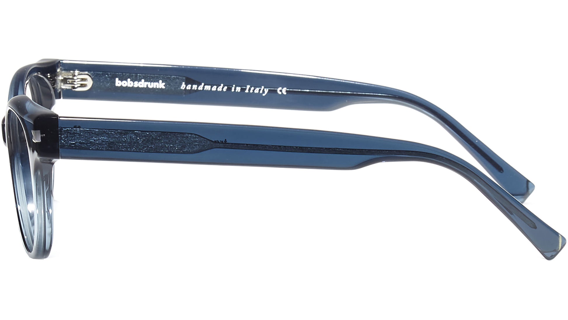 Bobsdrunk Tracy optical model in 132 color variant, transparent ink blue. Timeless products and bold shapes coexist in this 2023 optical collection. The lines are masterfully designed to create a “bold lightness” effect.Every pair of glasses is characterized by an emblematic detail shown on the front and on the temple tip, which highlights the value of the brand. The detail represents the union of the initial and final letter of Bobsdrunk in a single symbol. The careful choice of materials, the selection of workmanship and the extensive chromatic research are the prerogatives for every Bobsdrunk creation.