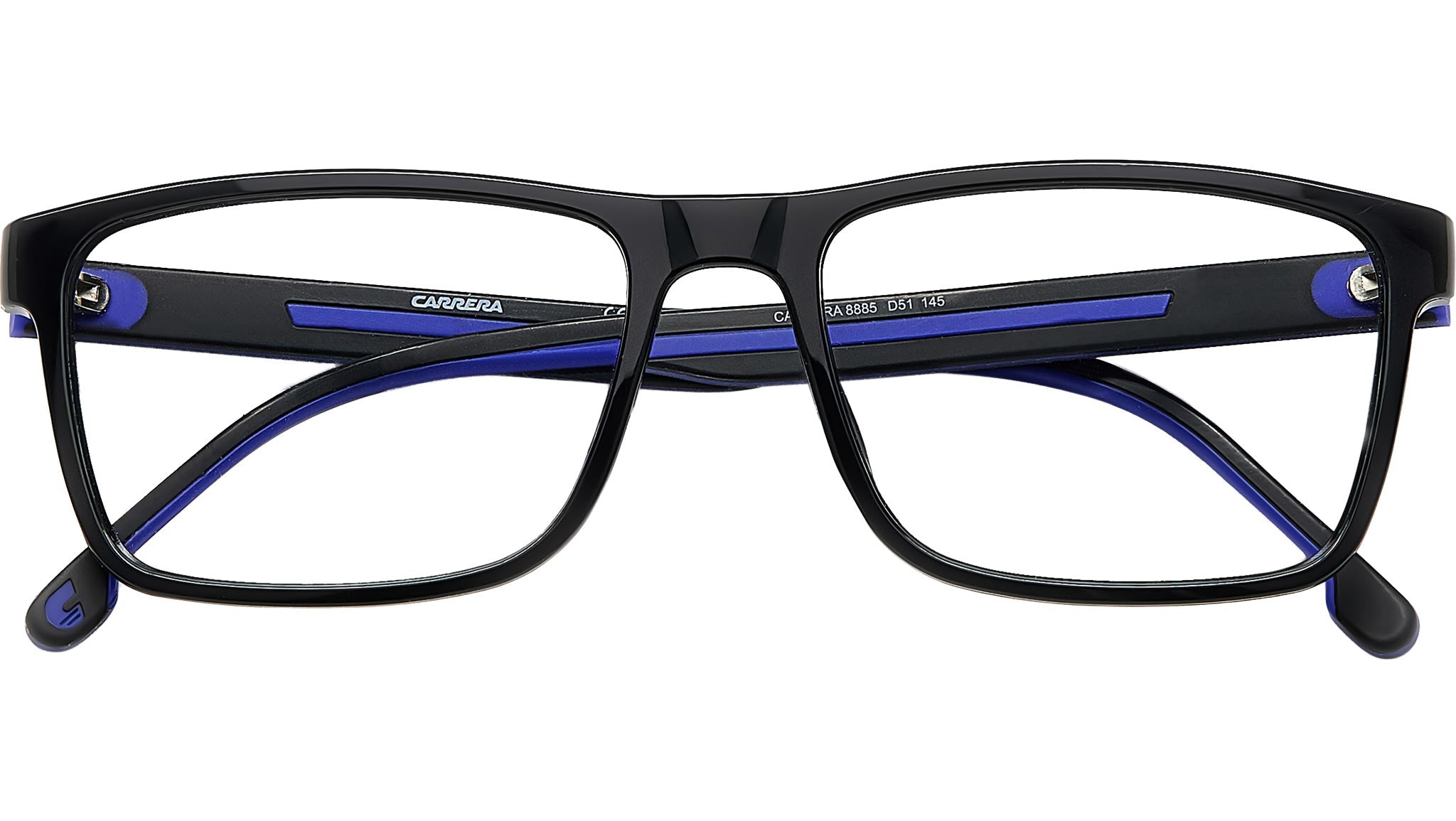 Carrera optical frame model 8885 color code D51 Black Blue. These Carrera eyeglasses express the freedom of a sporty style. The high technical quality comes from the polyamide material and the dual-injection technology: a guarantee of lightness and resistance. They are available in different colours, all characterised by contrasting accents on the temples, designed to create a look that is both casual and athletic.