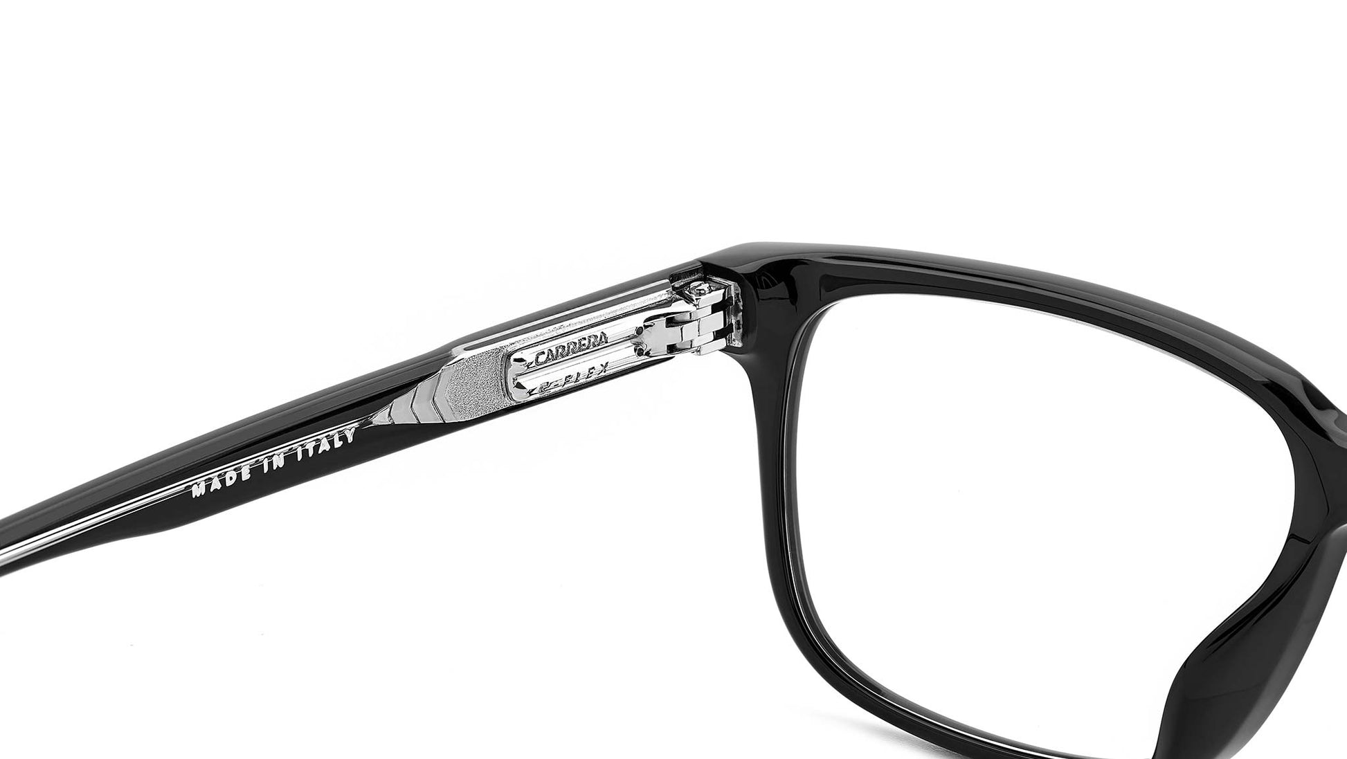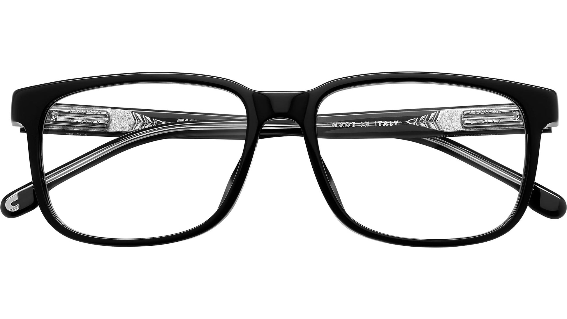 Carrera C FLEX 03/G 807 glasses for men, featuring black rectangular acetate frame and demo lens lenses. Brand line: Signature. Style code: 108077. Color code: 807. Authorized Carrera online reseller. Your glasses will include the original case and accessories and are covered by a 12-month global warranty.