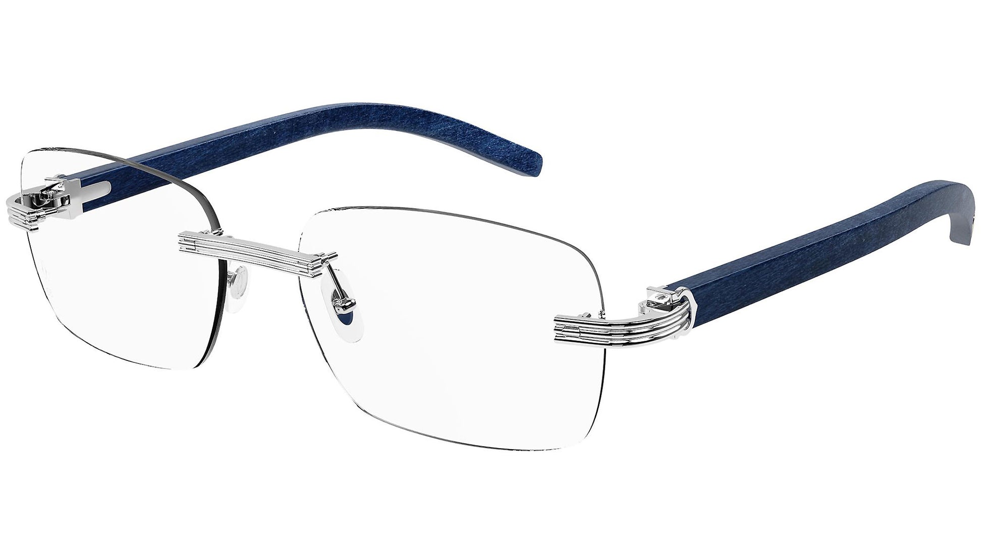 Cartier Exception optical collection model 0286O 005 featuring smooth platinum finish frame and blue temple.