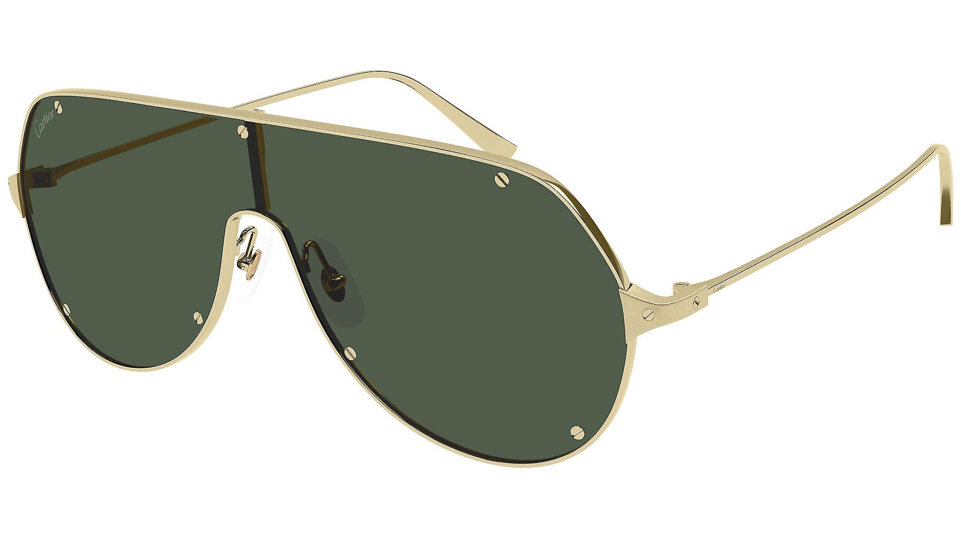 Cartier 0324S 002 sunglasses with smooth and brushed golden finish frame and green mask lens.