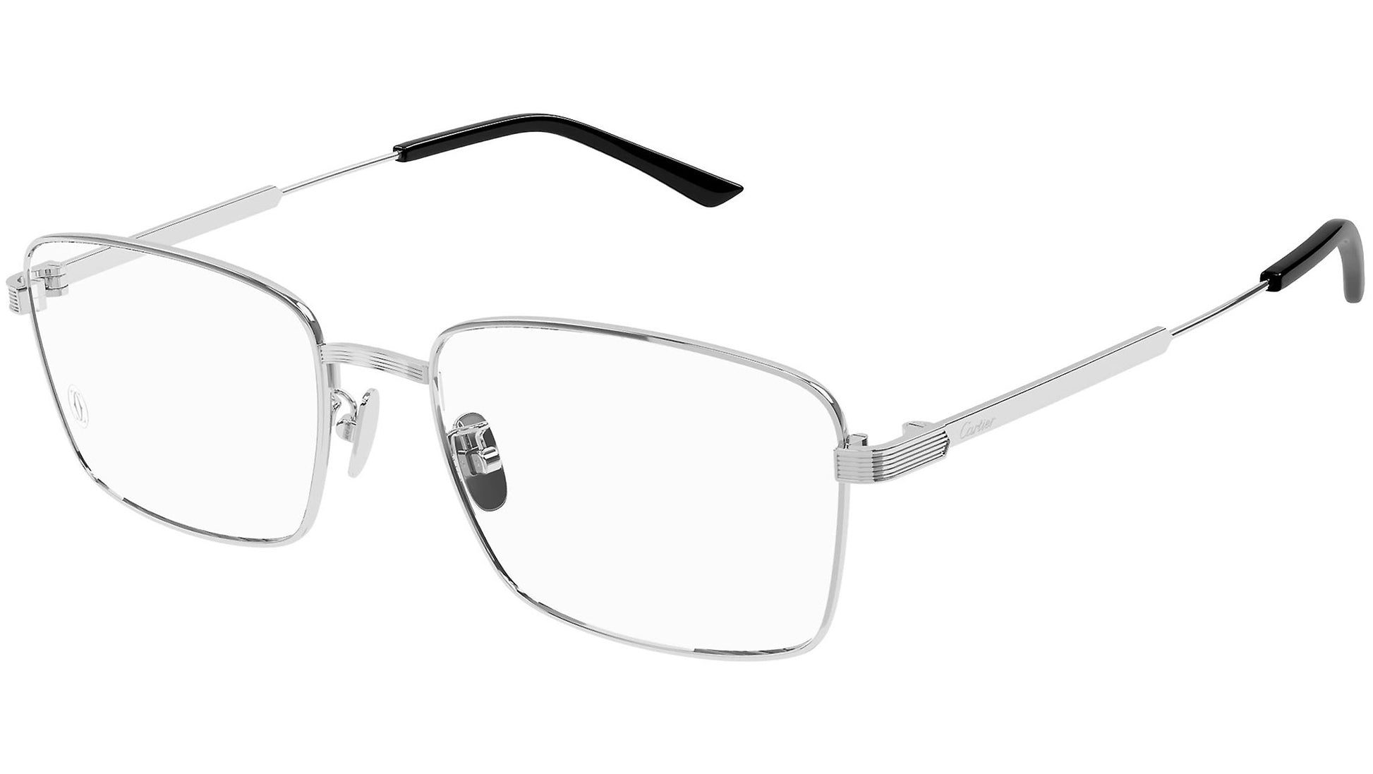 Cartier Core Range optical collection model 0347O 002 featuring smooth platinum finish frame and silver temple.