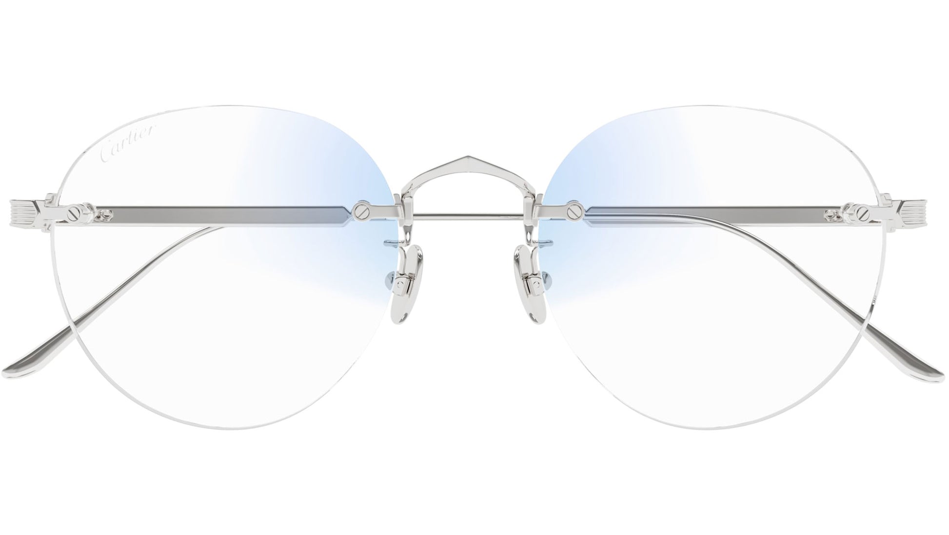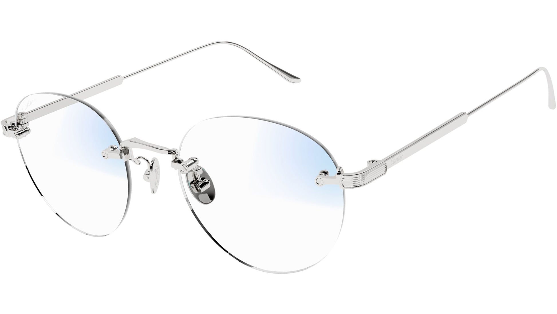 Cartier Core Range sunglasses collection model CT0393S 004 featuring smooth platinum finish frame and blue photocromic + AR Mac 4 blue reducer lens.