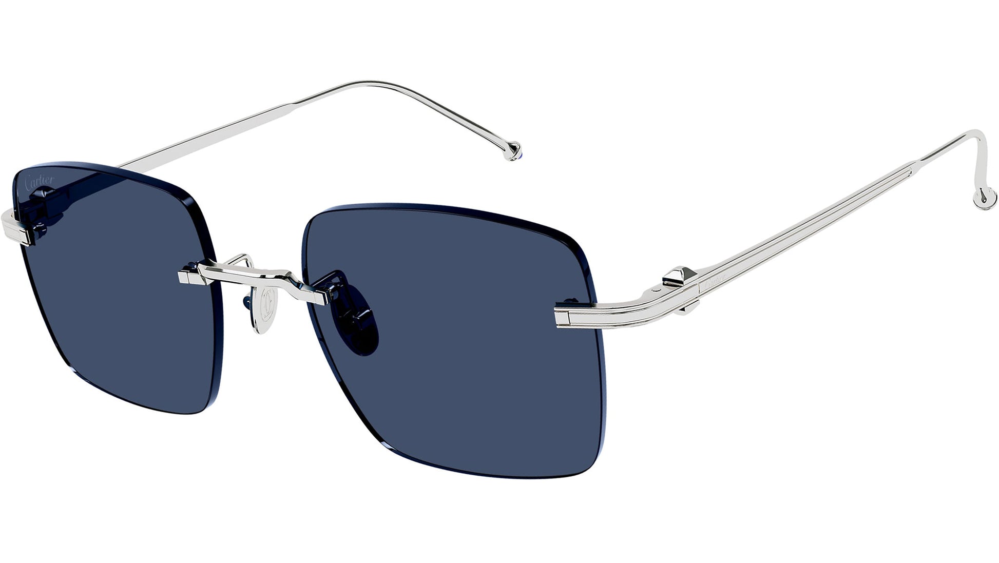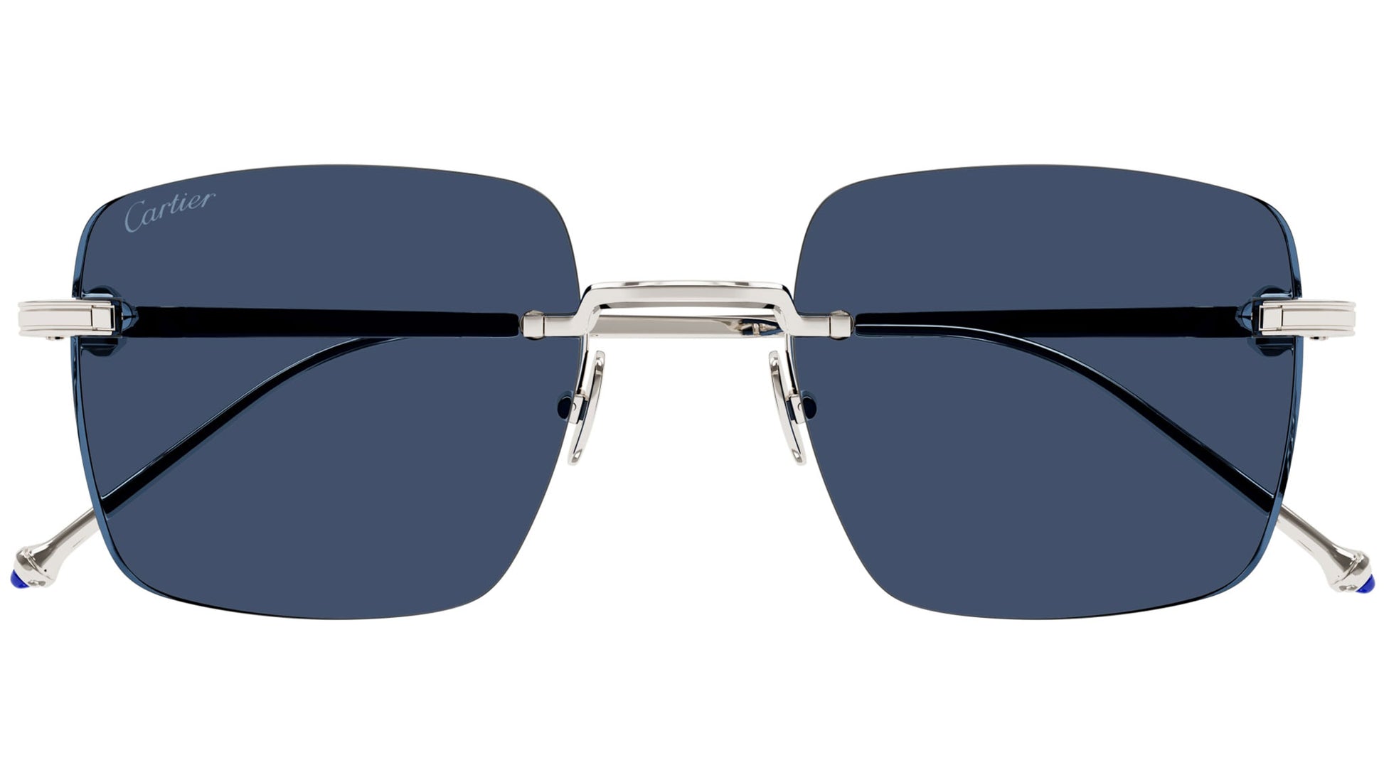 Cartier Exception sunglasses collection model CT0403S 001 featuring smooth platinum finish frame and blue lens.