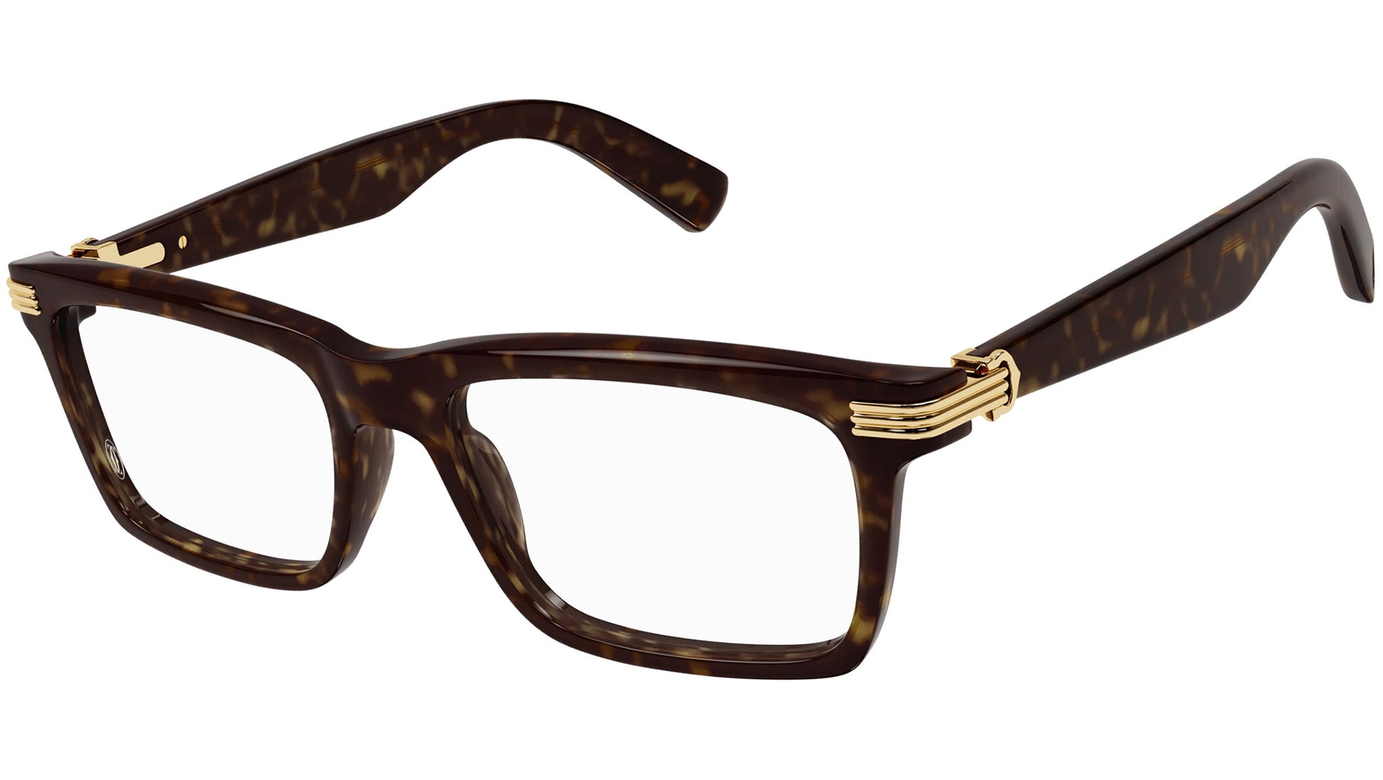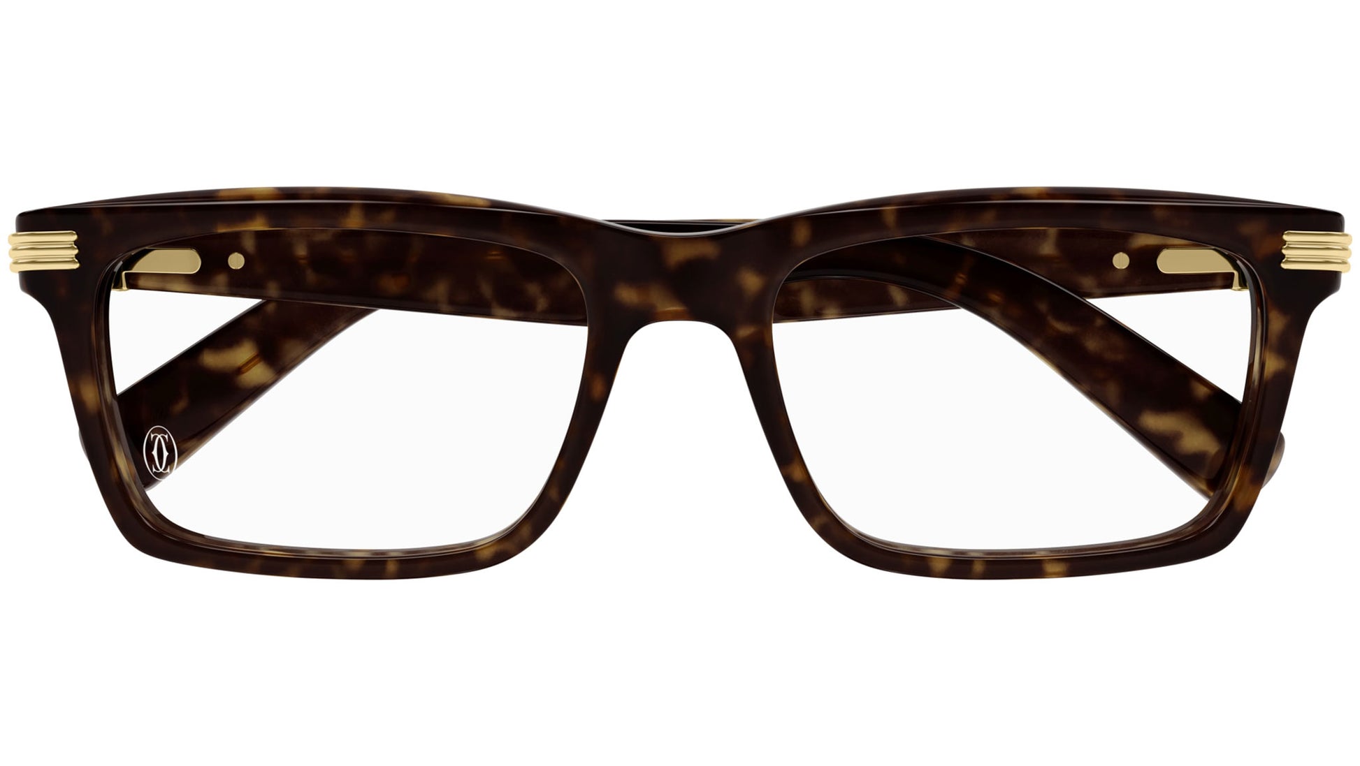 Cartier Contemporary optical collection model CT0420O 002 featuring dark tortoiseshell effect frame and havana temple.