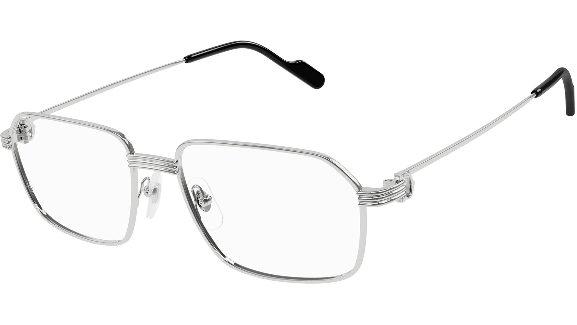 Cartier CT0445O glasses for men, featuring smooth platinum finish rectangular metal frame and recycled demo lens with hard coating and AR blue out lenses. Brand line: Core Range. Style code: CT0445O. Color code size 55: 002. Color code size 58: 004. Made in France. Authorized Cartier online reseller. Your glasses will include the original case and accessories and are covered by a 12-month global warranty.