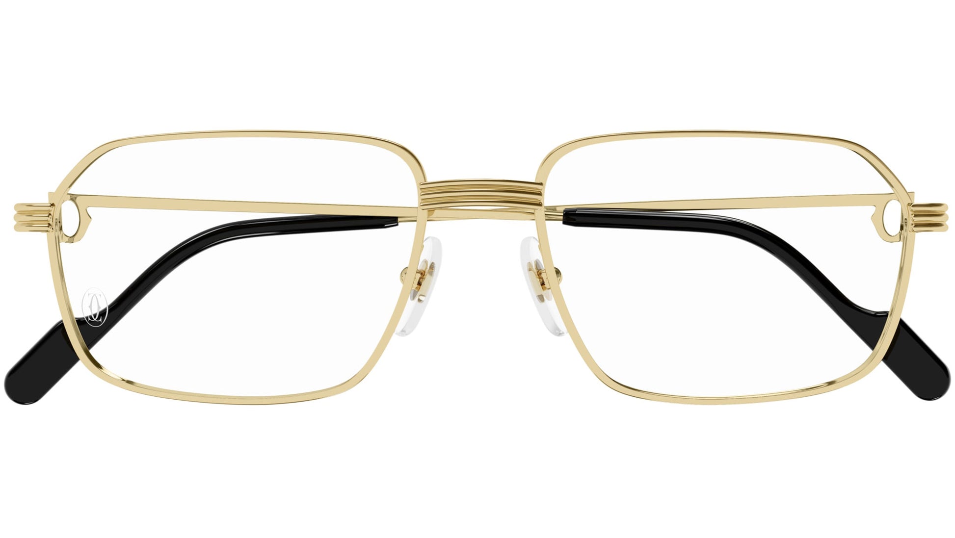 Cartier CT0445O glasses for men, featuring smooth golden finish rectangular metal frame and recycled demo lens with hard coating and AR blue out lenses. Brand line: Core Range. Style code: CT0445O. Color code size 55: 001. Color code size 58: 003. Made in France. Authorized Cartier online reseller. Your glasses will include the original case and accessories and are covered by a 12-month global warranty.