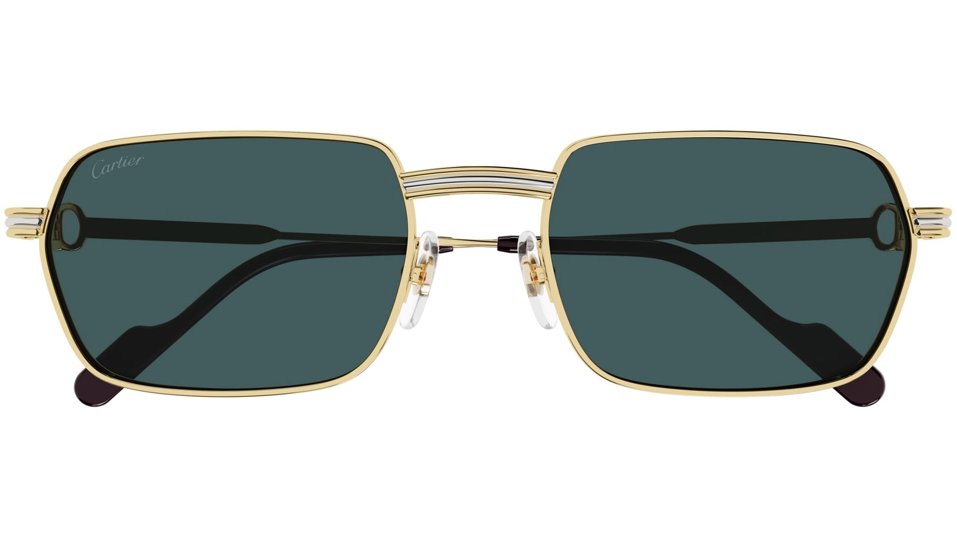 Cartier Core Range sunglasses model CT0463S rectangle metal frame color code 002 smooth golden and platinum finish with gold temple and green lens.
