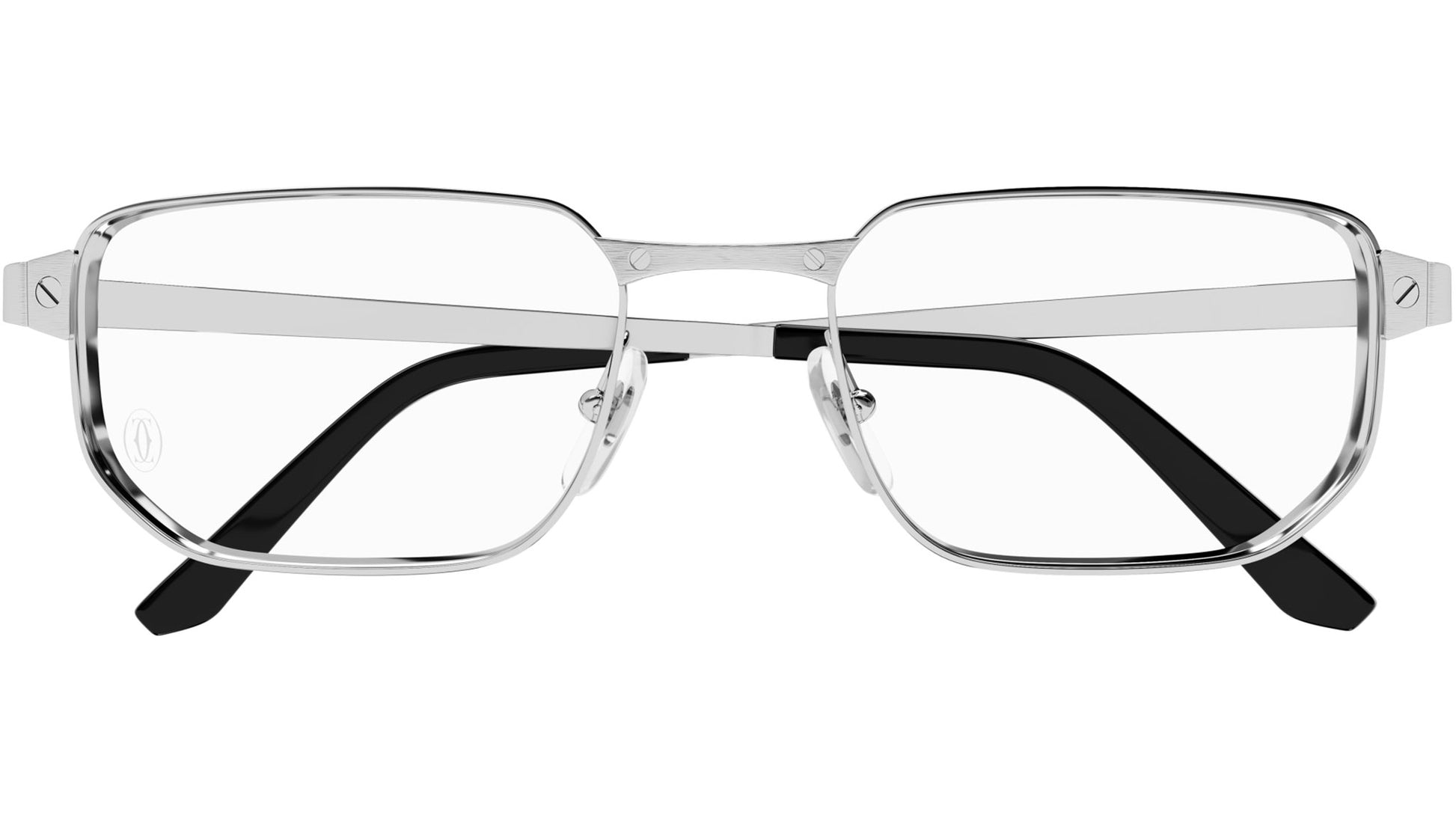 Cartier Core Range eyewear model CT0481O rectangle metal glasses color code 002 smooth brushed platinum finish with silver temple and recycled demo lens with hard coating and AR blue out.