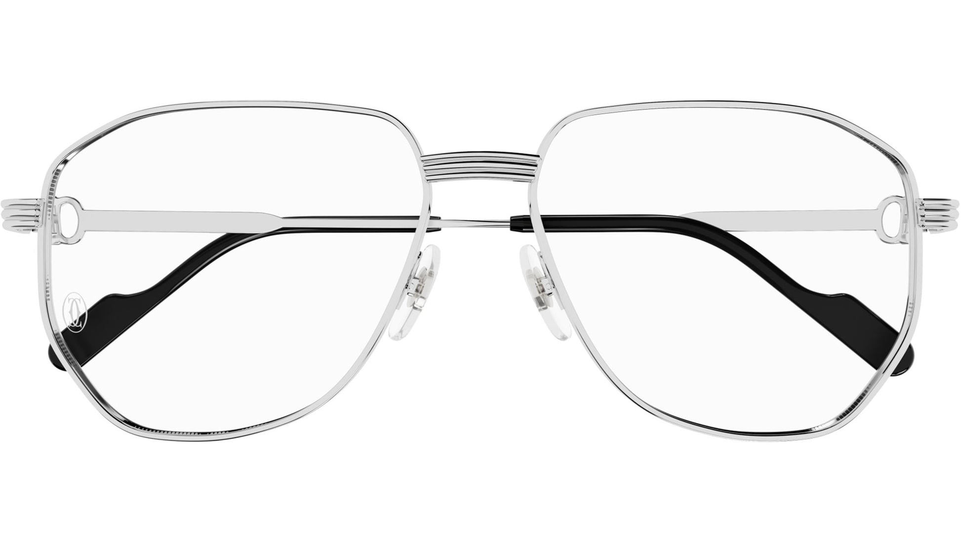 Cartier Core Range eyewear model CT0484O aviator metal glasses color code 002 smooth platinum finish with silver temple and recycled demo lens with hard coating and AR blue out.