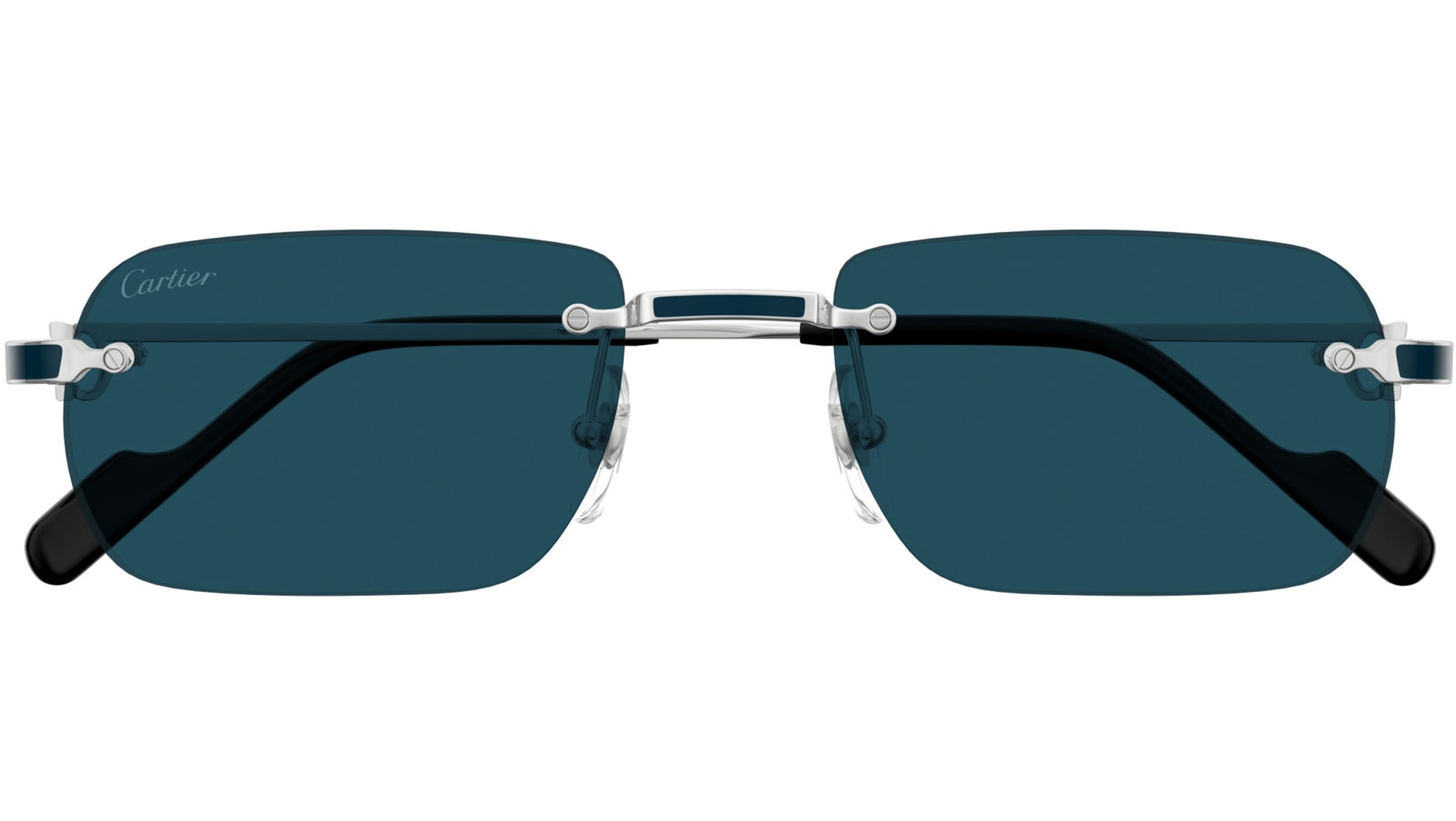 Cartier Exception sunglasses model CT0498S rectangle metal frame color code 004 smooth platinum finish with silver temple and petrol lens.