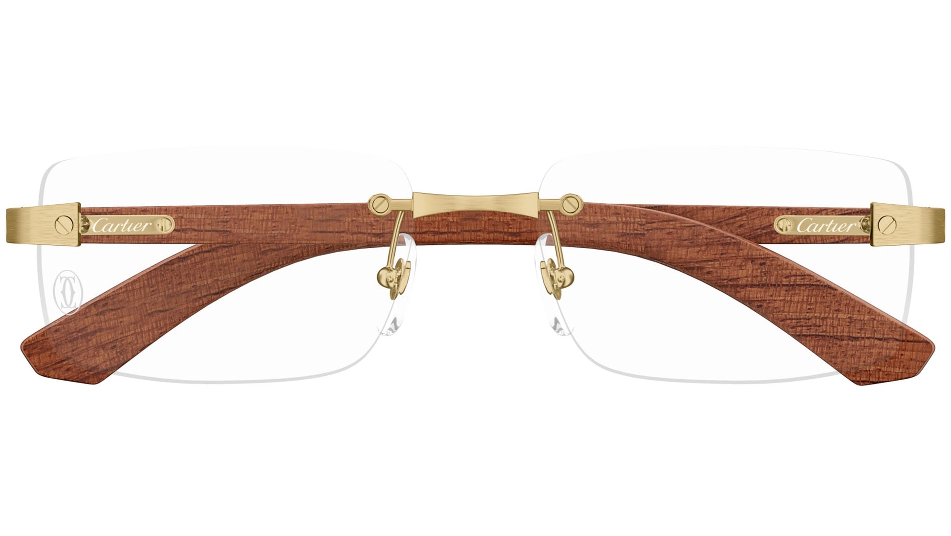 Cartier Exception eyewear model CT0513O rectangle metal glasses color code 002 brushed golden finish with brown temple and recycled demo lens with hard coating and AR blue out.