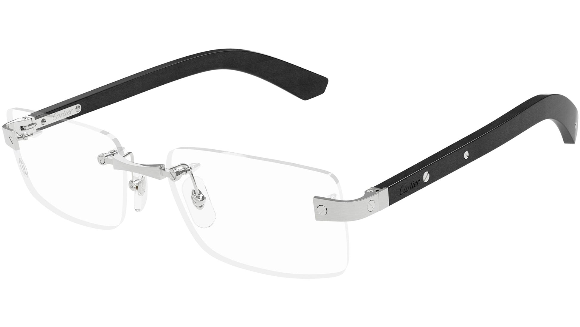 Cartier Exception eyewear model CT0513O rectangle metal glasses color code 003 brushed platinum finish with black temple and recycled demo lens with hard coating and AR blue out.