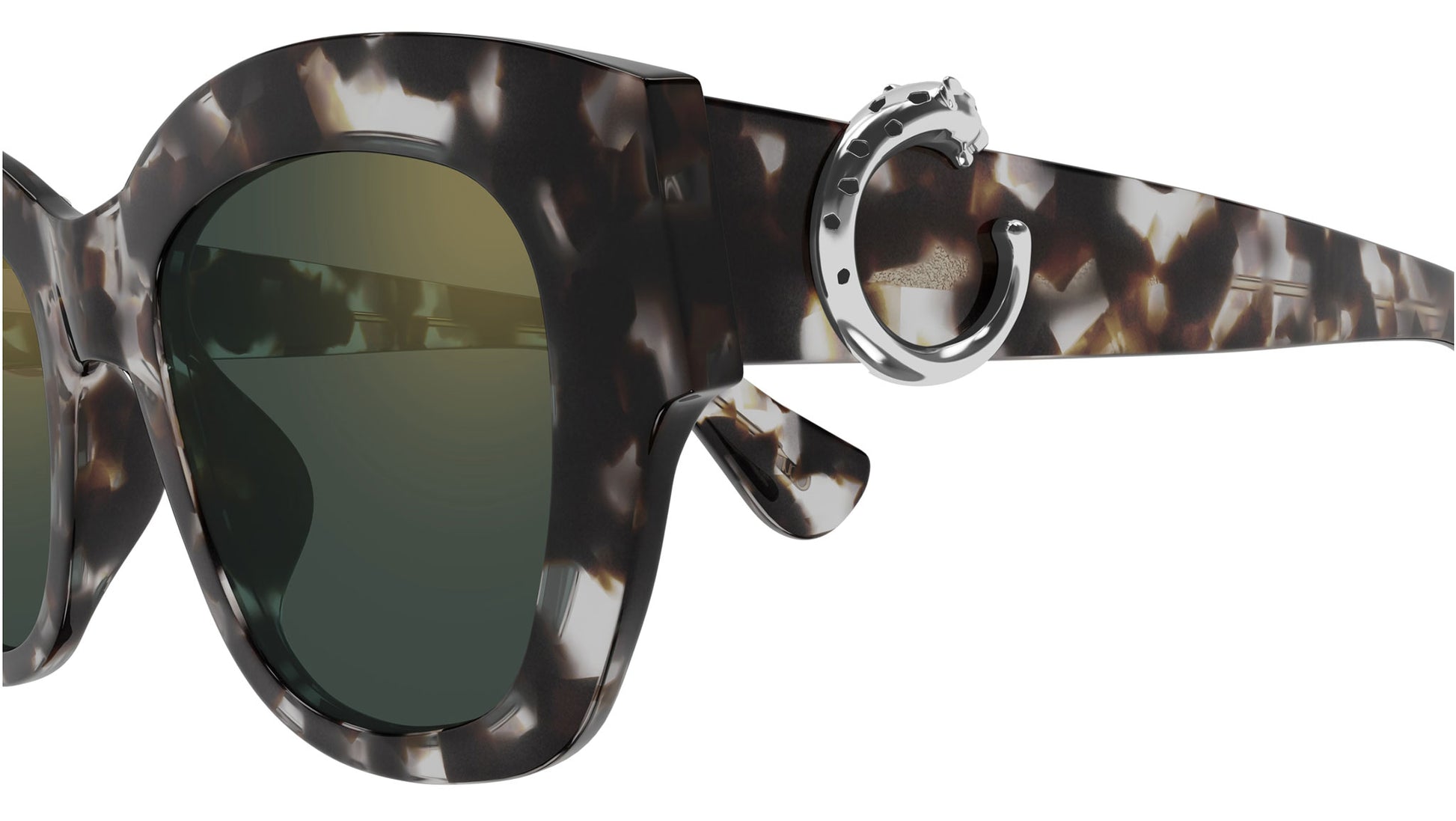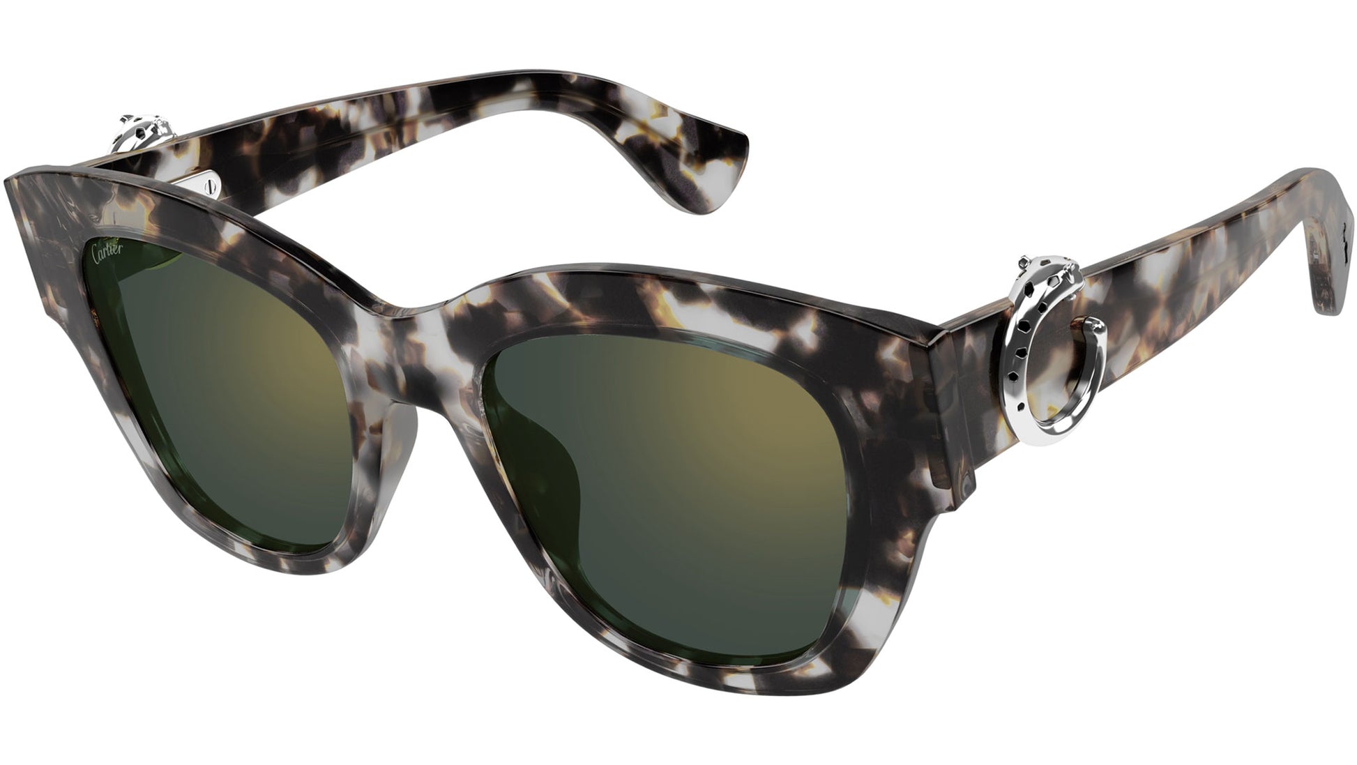 Cartier CT0547S 004 sunglasses for women, featuring spotted grey tortoiseshell effect cat eye recycled acetate frame and green with a golden flash nylon lenses. Brand line: Core Range. Style code: CT0547S. Color code: 004. Made in Italy. Authorized Cartier online reseller. Your glasses will include the original case and accessories and are covered by a 12-month global warranty.