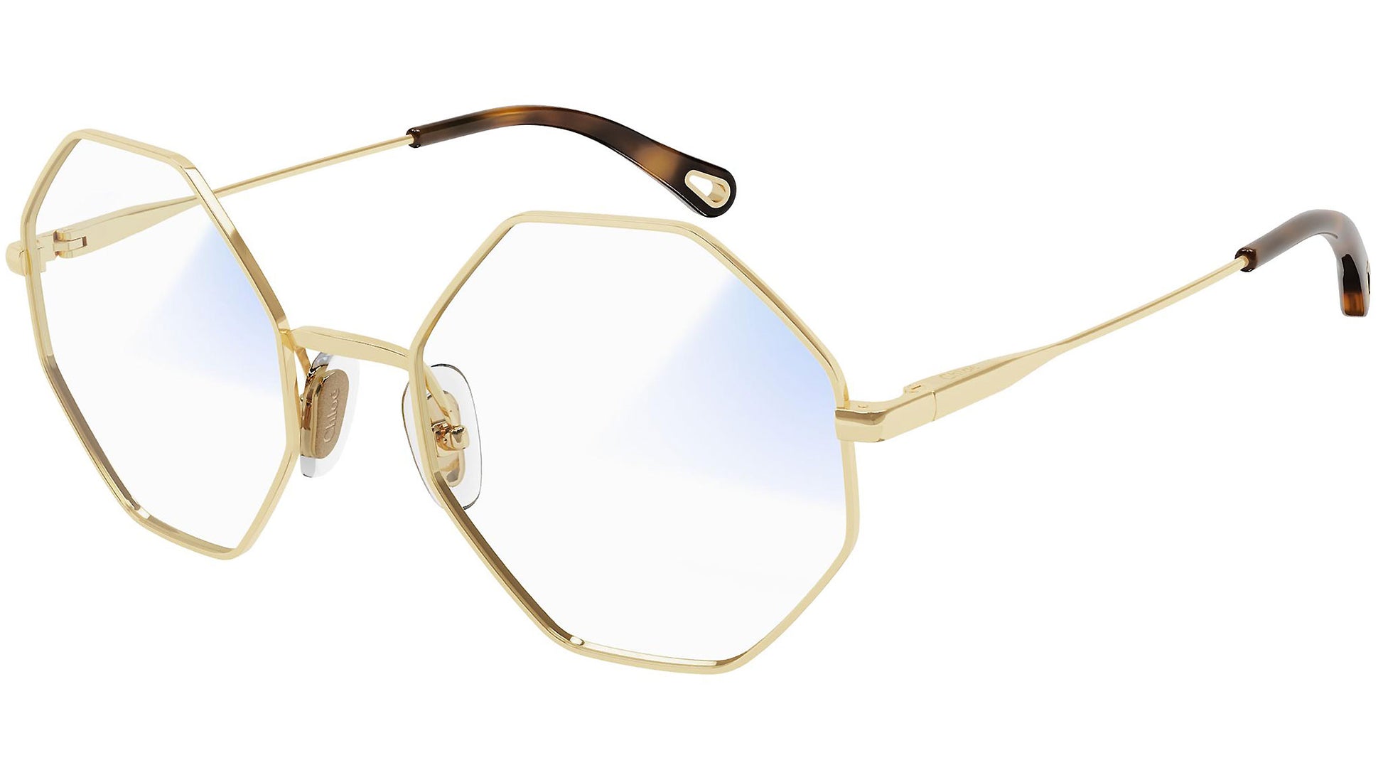 Chloé 0022S 001 sunglasses with shiny classic gold frame and demo to warm brown photocromic + blue reducer lens.