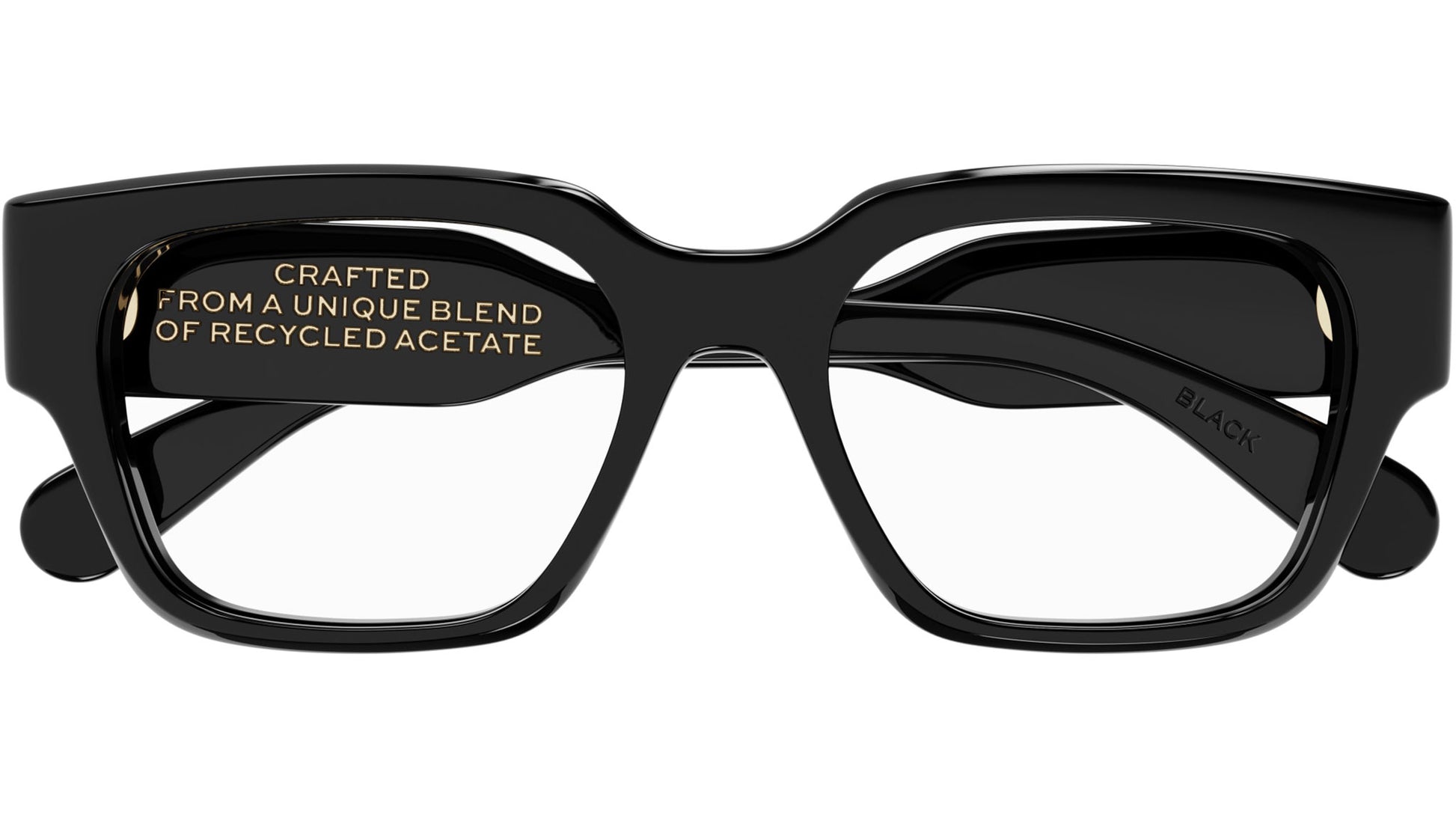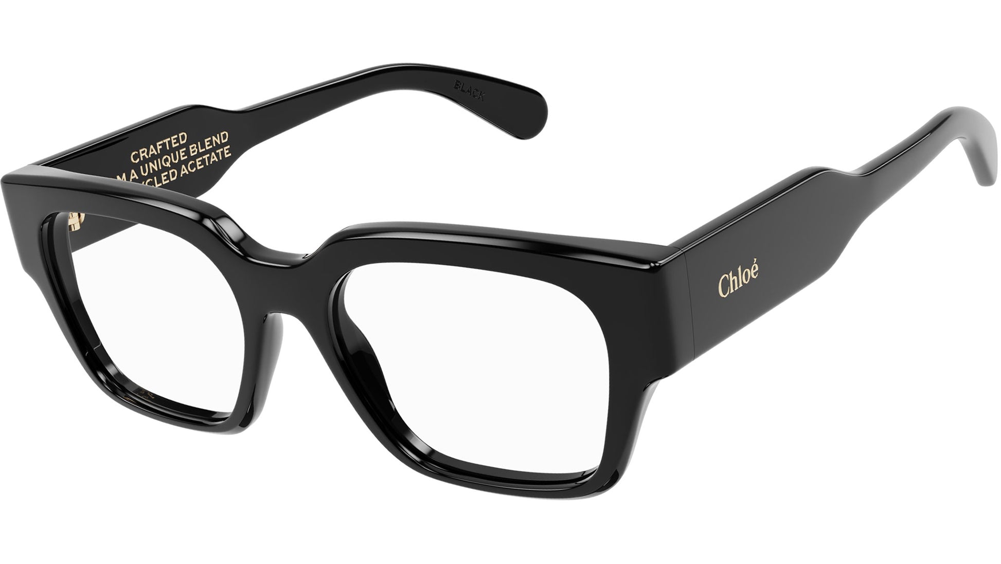Chloé CH0150O 001 glasses for women, featuring shiny solid black rectangular recycled acetate frame and demo lenses. Brand line: Chloé. Style code: CH0150O. Color code: 001. Made in Italy. Authorized Chloé online reseller. Your glasses will include the original case and accessories and are covered by a 12-month global warranty.