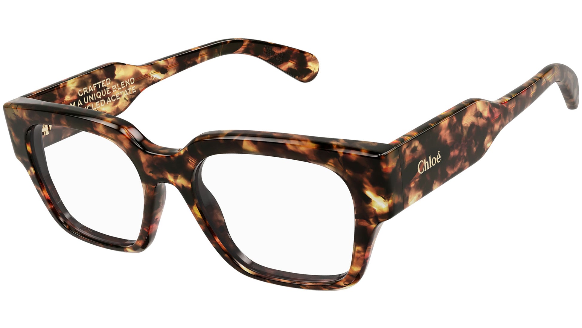 Chloé CH0150O 003 glasses for women, featuring shiny marble havana rectangular recycled acetate frame and demo lenses. Brand line: Chloé. Style code: CH0150O. Color code: 003. Made in Italy. Authorized Chloé online reseller. Your glasses will include the original case and accessories and are covered by a 12-month global warranty.
