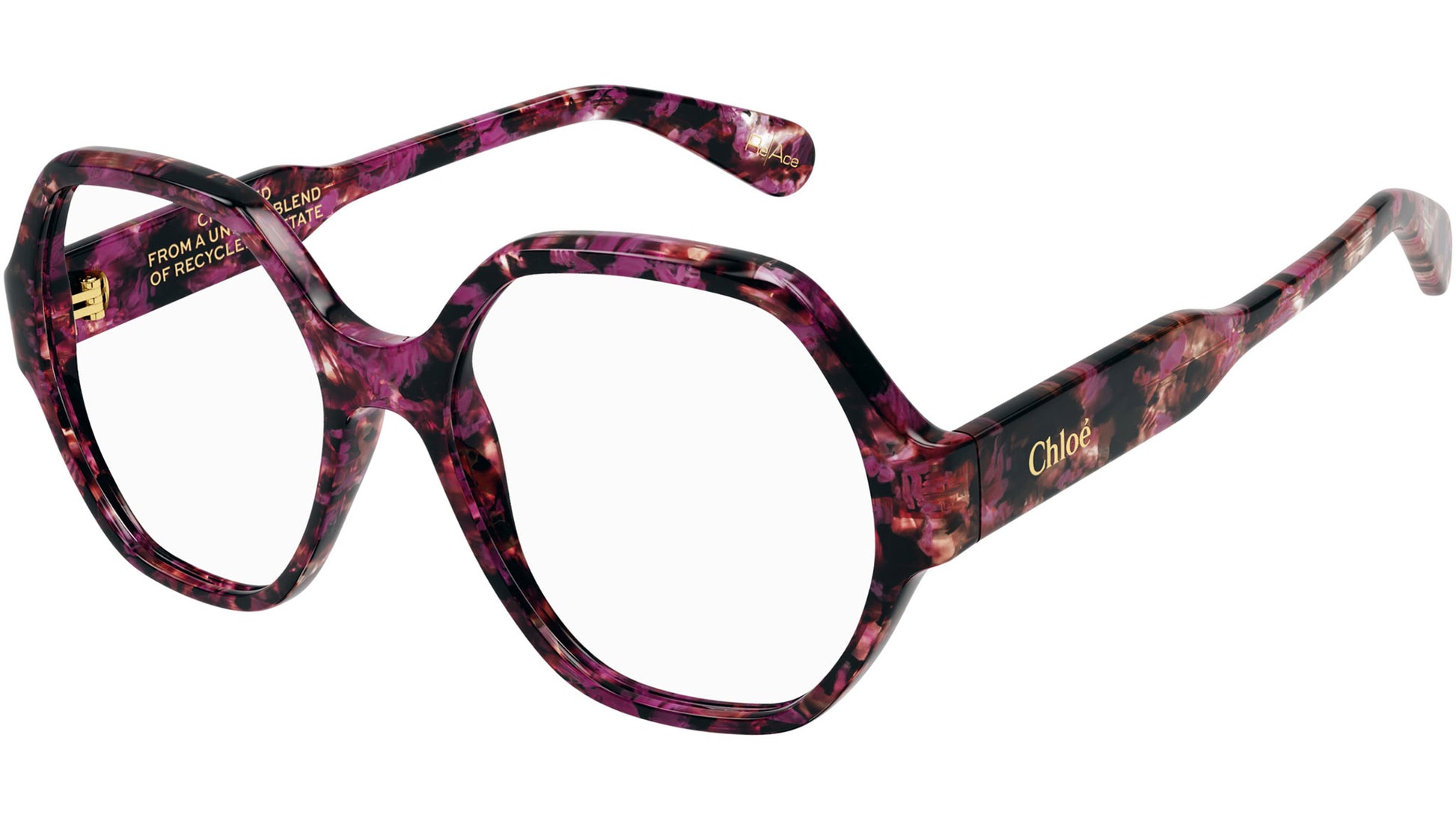 Chloé CH0189O 012 glasses for women, featuring dark rose peonies rectangular recycled acetate frame and demo lenses. Brand line: Chloé. Style code: CH0189O. Color code: 012. Made in Italy. Authorized Chloé online reseller. Your glasses will include the original case and accessories and are covered by a 12-month global warranty.