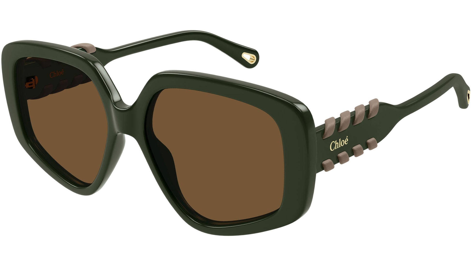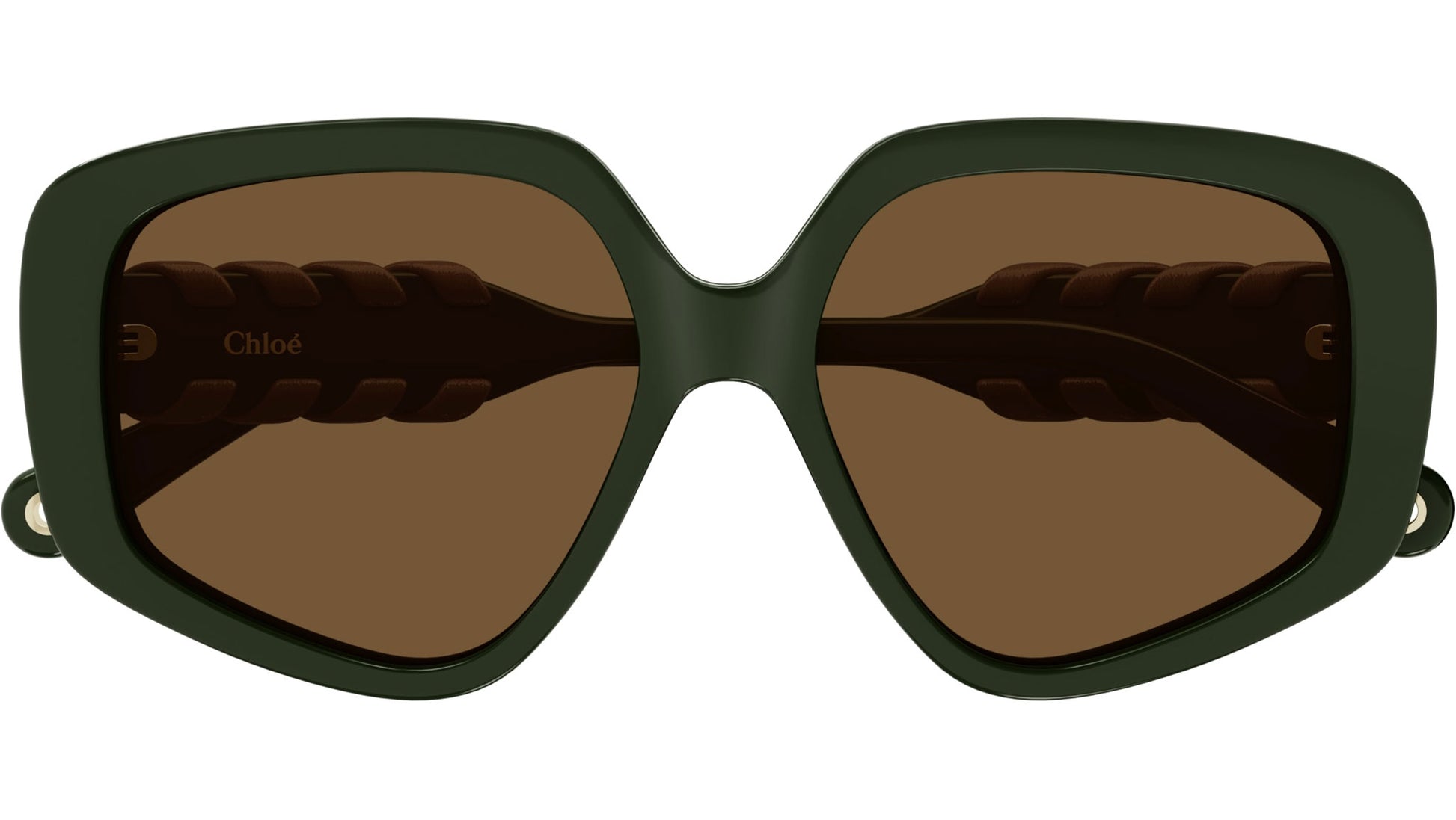 Chloé CH0210S 004 sunglasses for women, featuring shiny solid military green rectangular recycled acetate frame and solid brown bio nylon lenses. Brand line: Chloé. Style code: CH0210S. Color code: 004. Made in Italy. Authorized Chloé online reseller. Your glasses will include the original case and accessories and are covered by a 12-month global warranty.