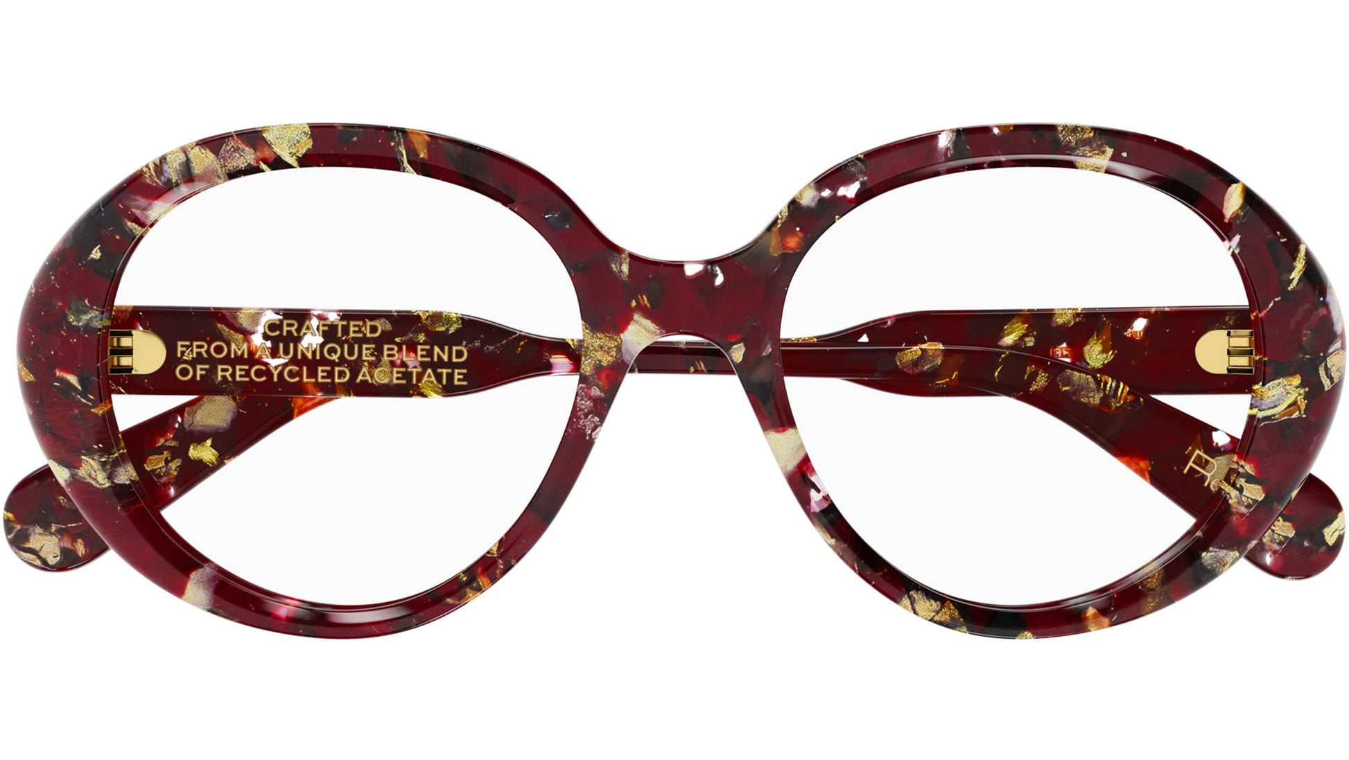 Chloé CH0221O 004 glasses for women, featuring garnet red panthos recycled acetate frame and demo lenses. Brand line: Chloé. Style code: CH0221O. Color code: 004. Made in Italy. Authorized Chloé online reseller. Your glasses will include the original case and accessories and are covered by a 12-month global warranty.