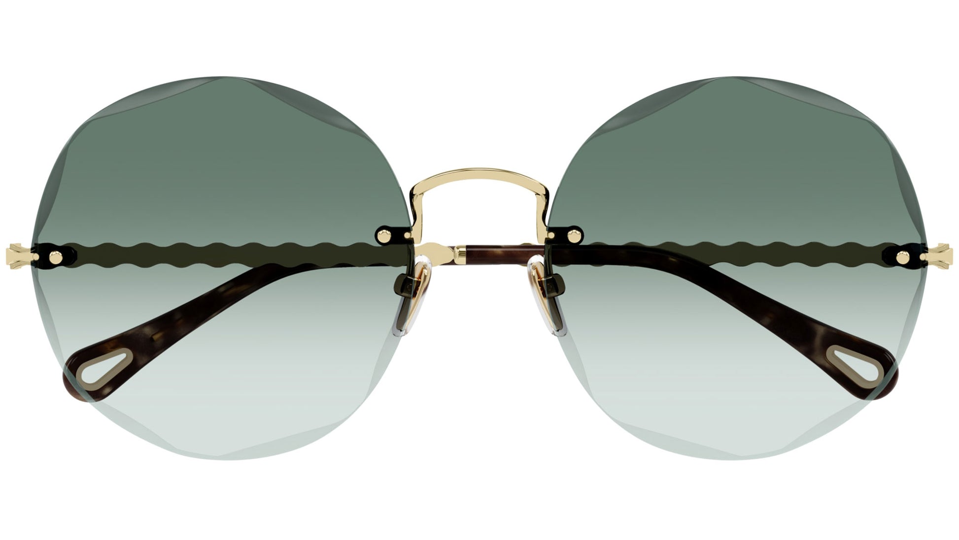 Chloé CH0254S 003 sunglasses for women, featuring shiny classic gold panthos metal frame and gradient teal bio nylon lenses. Brand line: Chloé. Style code: CH0254S. Color code: 003. Made in Japan. Authorized Chloé online reseller. Your glasses will include the original case and accessories and are covered by a 12-month global warranty.