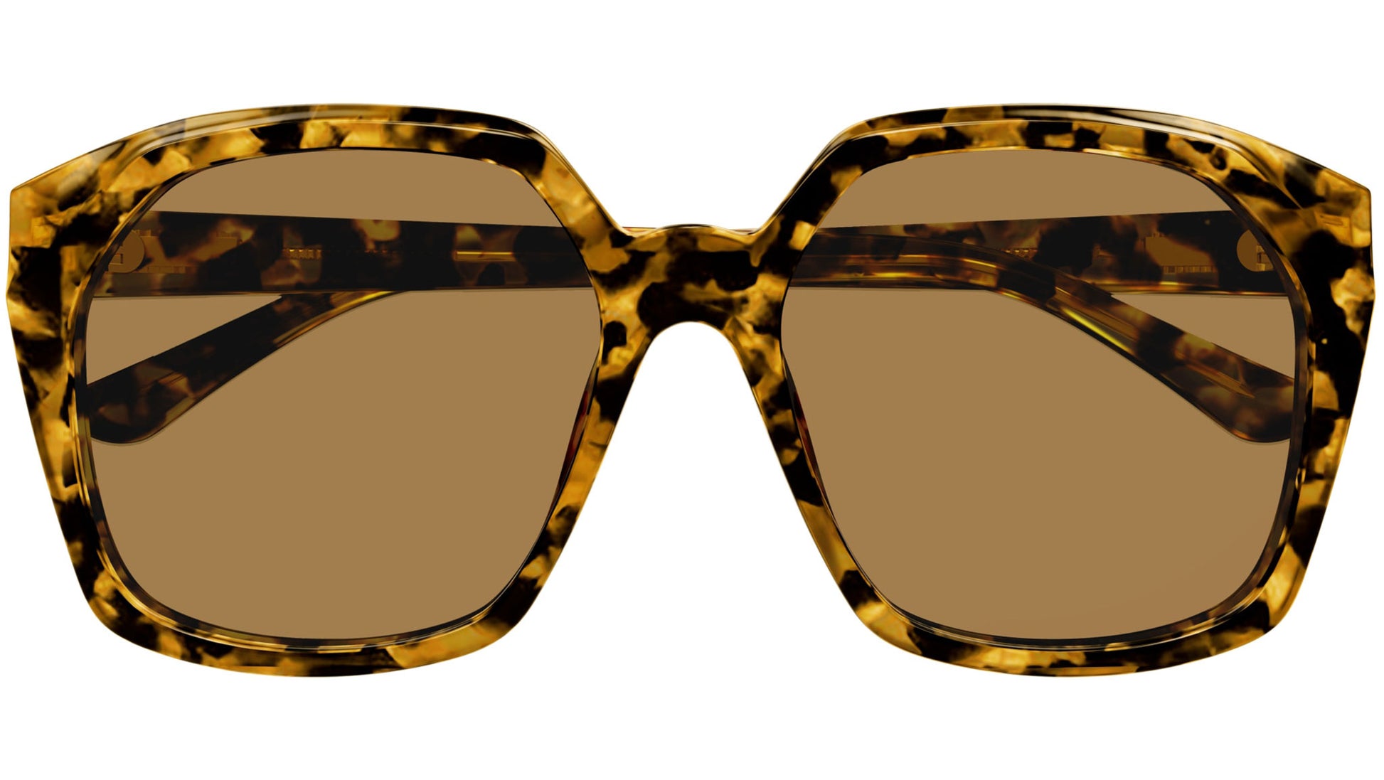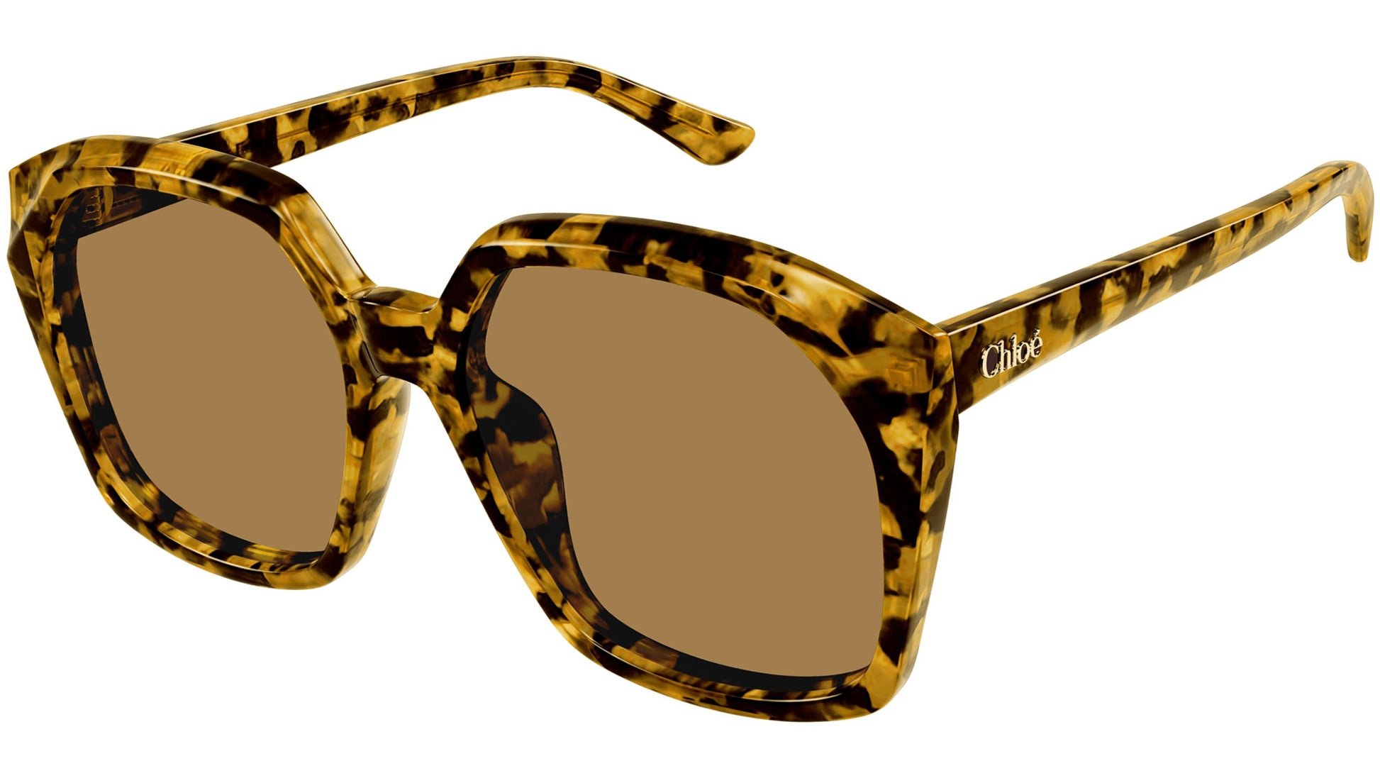 Chloé CH0280S 007 sunglasses for women, featuring shiny spotted havana rectangular recycled acetate frame and solid brown bio nylon lenses. Brand line: Chloé. Style code: CH0280S. Color code: 007. Made in Italy. Authorized Chloé online reseller. Your glasses will include the original case and accessories and are covered by a 12-month global warranty.