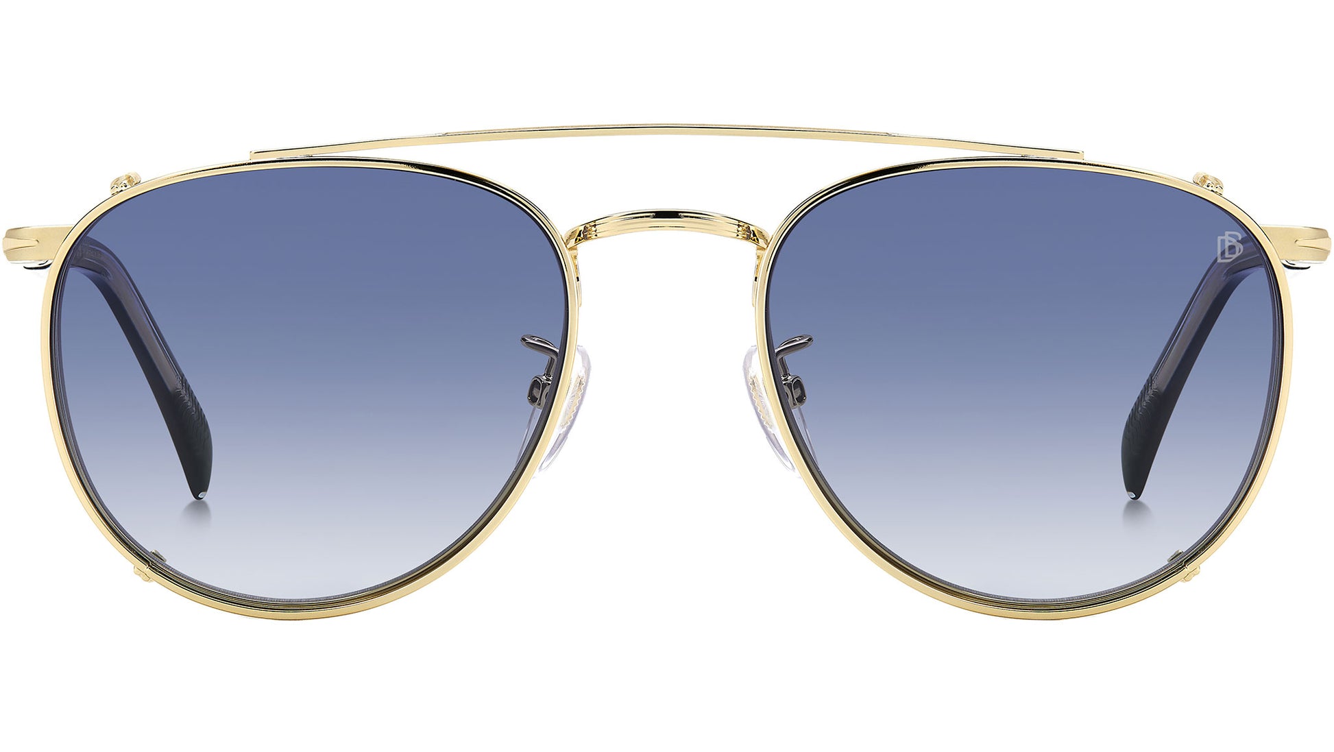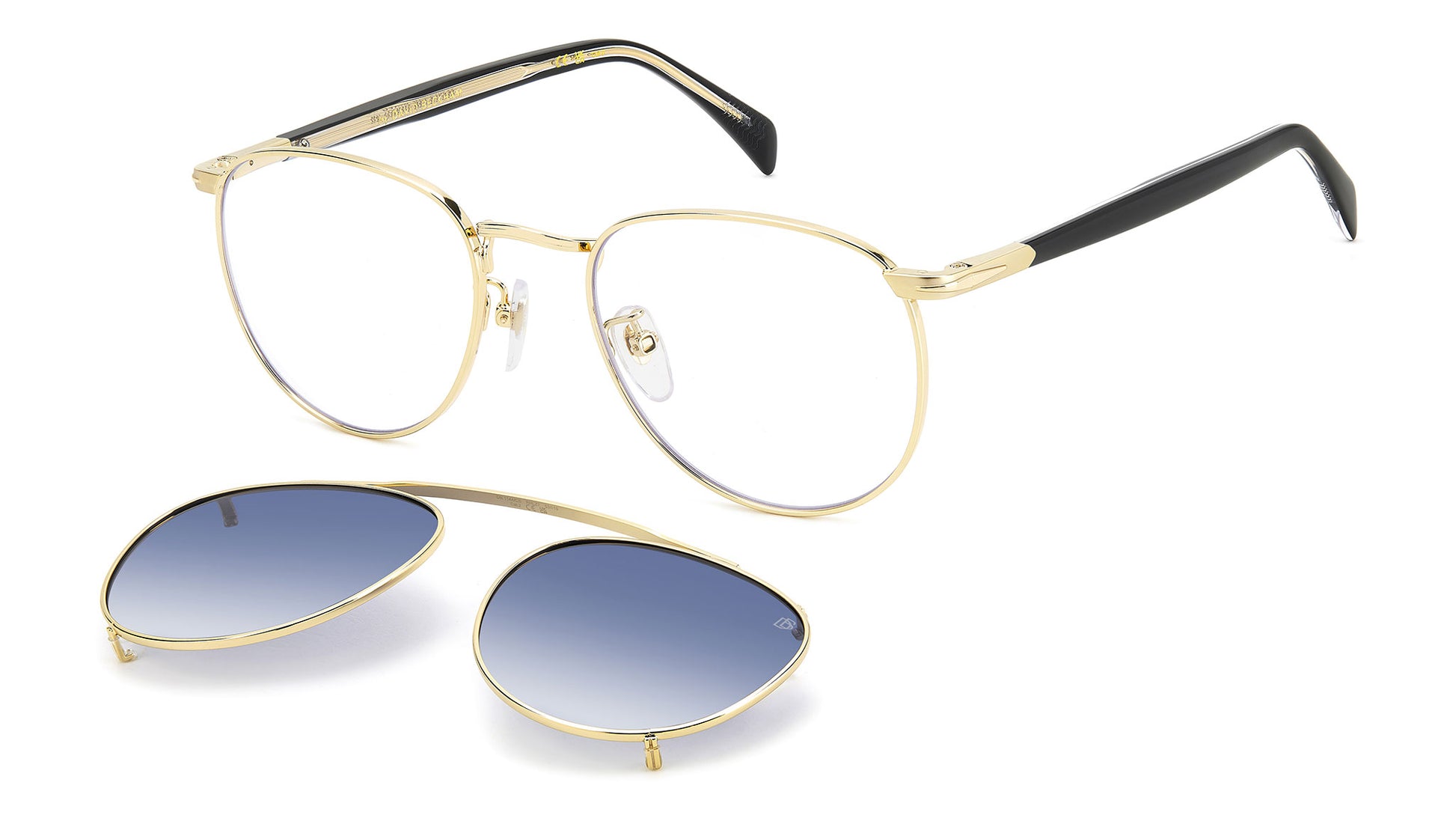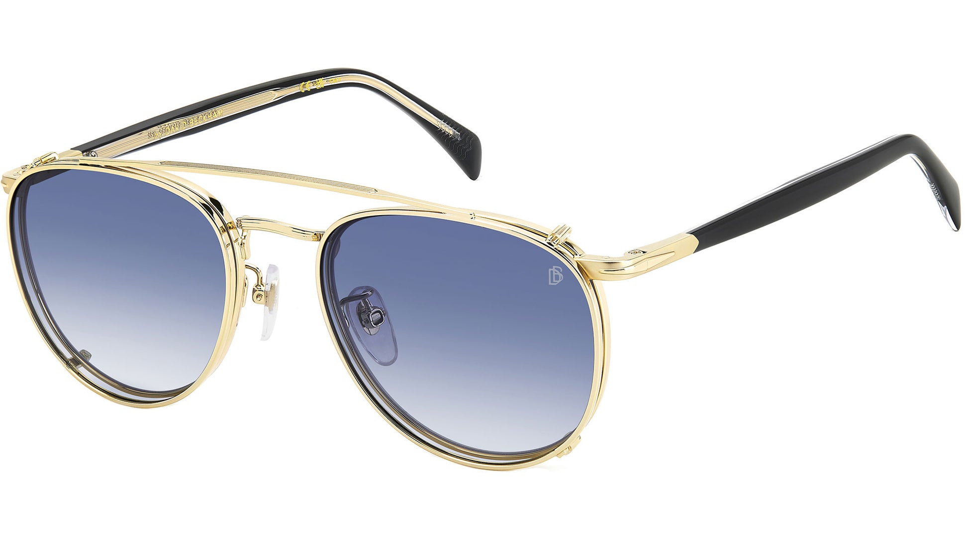 David Beckham sunglasses model DB 1144/CS color code RHL Z7 gold black. These eyeglasses with clip-on sun lenses are classic yet undeniably cool. Perfect for every adventure, the sun lenses attach to the frames quickly and easily, for impeccable vision even on bright, sunny days. Constructed in stainless steel, the frames rest on nose pads and extend into acetate temples. David Beckham's signature details are a must: the stylized rhombus, the full name of the brand on the inner temple, and the monogram on the sun lenses.