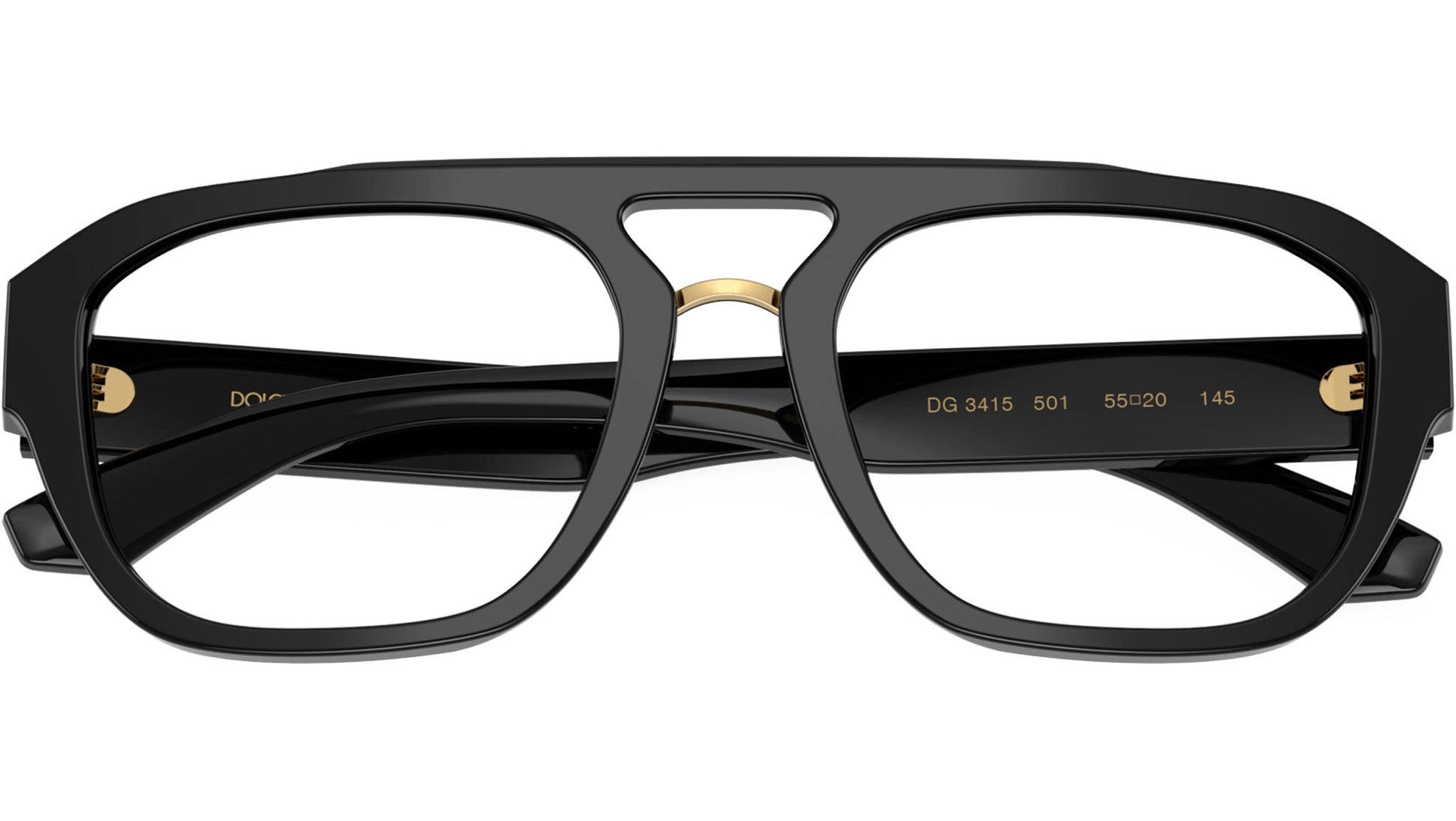 Dolce & Gabbana DG 3415 501 glasses for men, featuring black pilot acetate frame and demo lens. Universal fit. Brand line: Dna. Style code: 0DG3415. Color code: 501. Made in Italy. Authorized Dolce & Gabbana online reseller. Your glasses will include the original case and accessories and are covered by a 12-month global warranty.