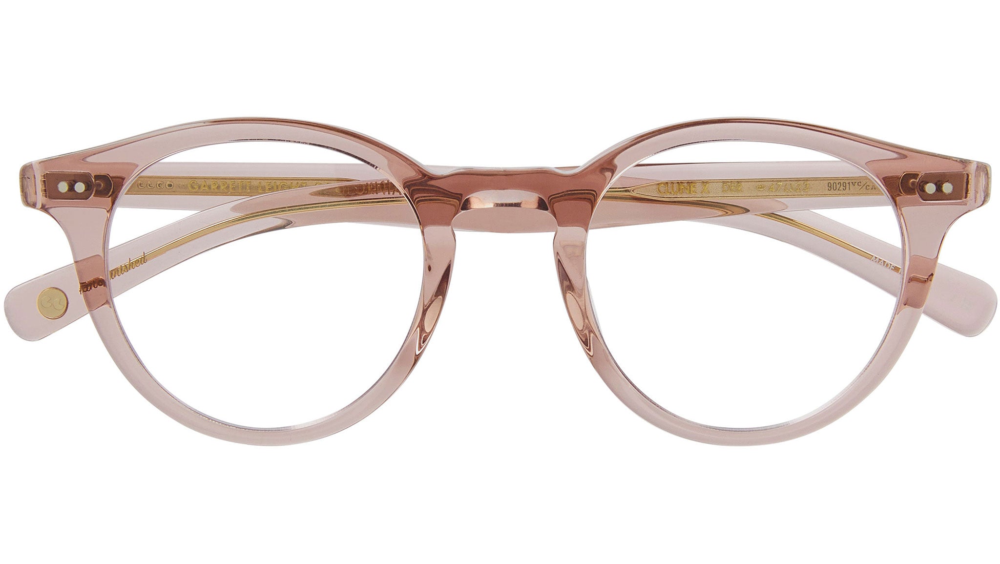 Garrett Leight Clune X glasses featuring desert rose round acetate frame and demo lens lenses. The Clune X frame, inspired by mid-century design, features a P3 silhouette with a thicker acetate than its predecessor. It incorporates a classic core wire and double pins at the endpiece, ensuring a durable and stylish construction. Key specifications include hand-finished optical quality CR-39 lenses, cured cellulose acetate, a keyhole nose bridge, and a 4 base lens with a backside anti-reflective coating. Additionally, it boasts 5 barrel hinges with real rivets and external pins for enhanced stability. Each frame comes with a soft case and cleaning cloth, making it a versatile and practical choice for all. Brand line: Forever Classics. Style code: 1129. Color code: DER. Authorized Garrett Leight online reseller. Your glasses will include the original case and accessories and are covered by a 12-month global warranty.