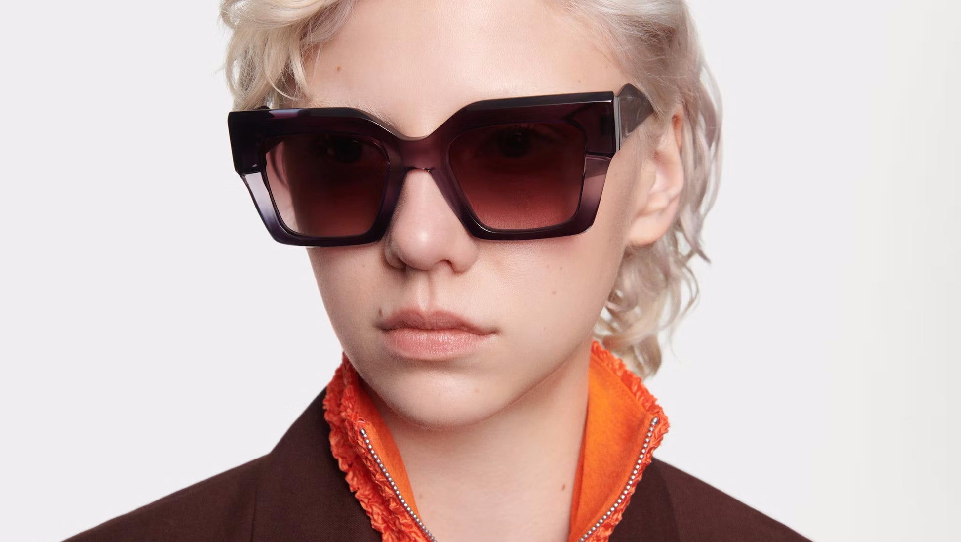 Gigi Studios Eyewar sunglasses model 6737 Kendall color code 3 in purple. A classic geometric full rim acetate glasses with purple gradient lenses. The brand ensures the highest quality through their meticulous selection of materials, partnering with top suppliers from Italy, Germany, and Japan. Gigi Studios provides an exceptional visual experience with CR-39 lenses that are comfortable and secure, effectively absorbing UVA and UVB rays.