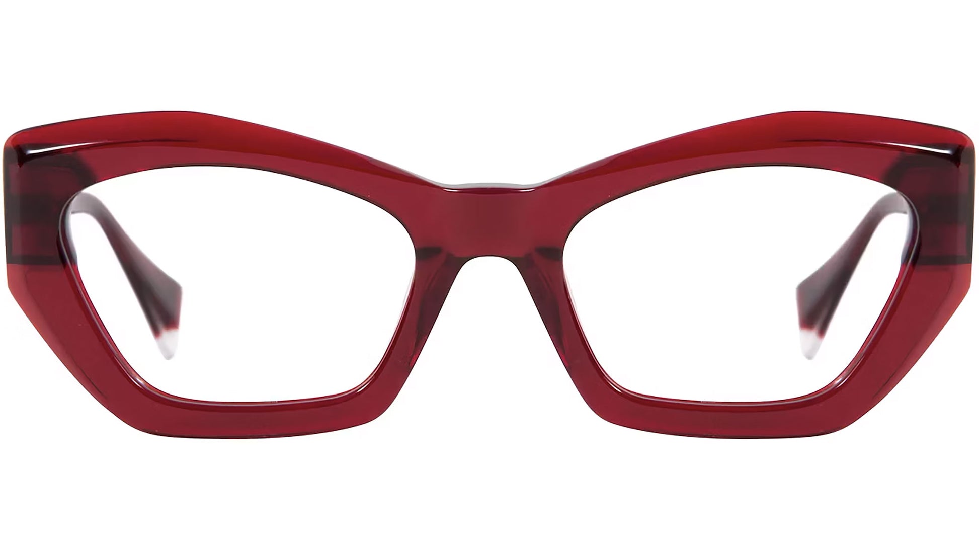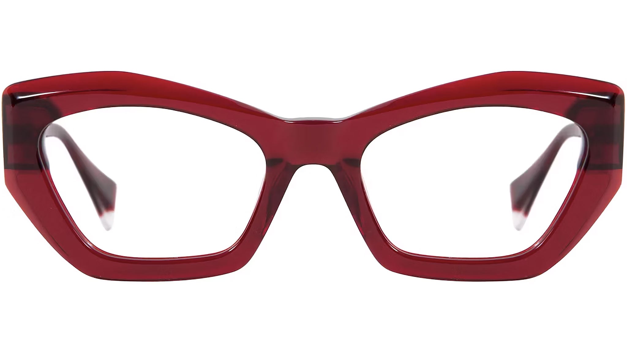 Gigi Studios Eyewar optical frame model 6727 Kira color code 6 in red. A classic cat eye full rim acetate glasses with transparent demo lens. Gigi Studios Eyewear ensures the highest quality through their meticulous selection of materials, partnering with top suppliers from Italy, Germany, and Japan. These collaborations guarantee a blend of sophistication, sustainability, and superior craftsmanship in every piece.