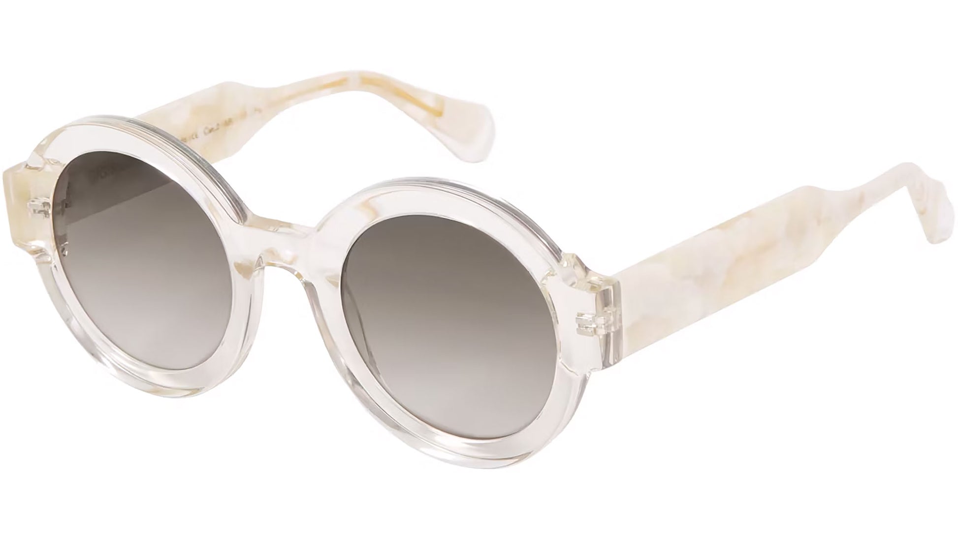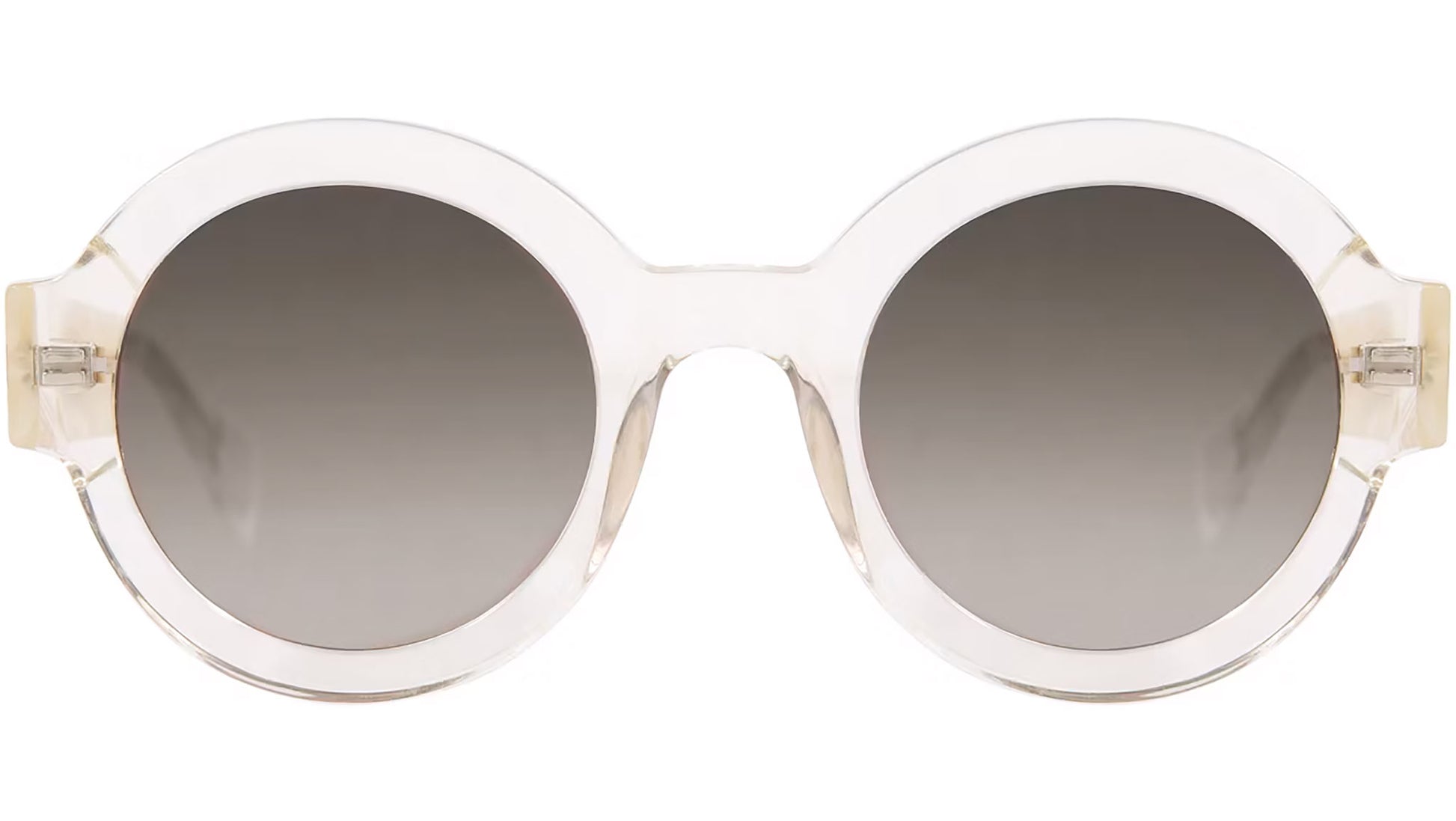Gigi Studios Eyewar sunglasses model 64543 Laura color code 8 in transparent. A classic round full rim acetate glasses with brown lenses. The brand ensures the highest quality through their meticulous selection of materials, partnering with top suppliers from Italy, Germany, and Japan. Gigi Studios provides an exceptional visual experience with CR-39 lenses that are comfortable and secure, effectively absorbing UVA and UVB rays.
