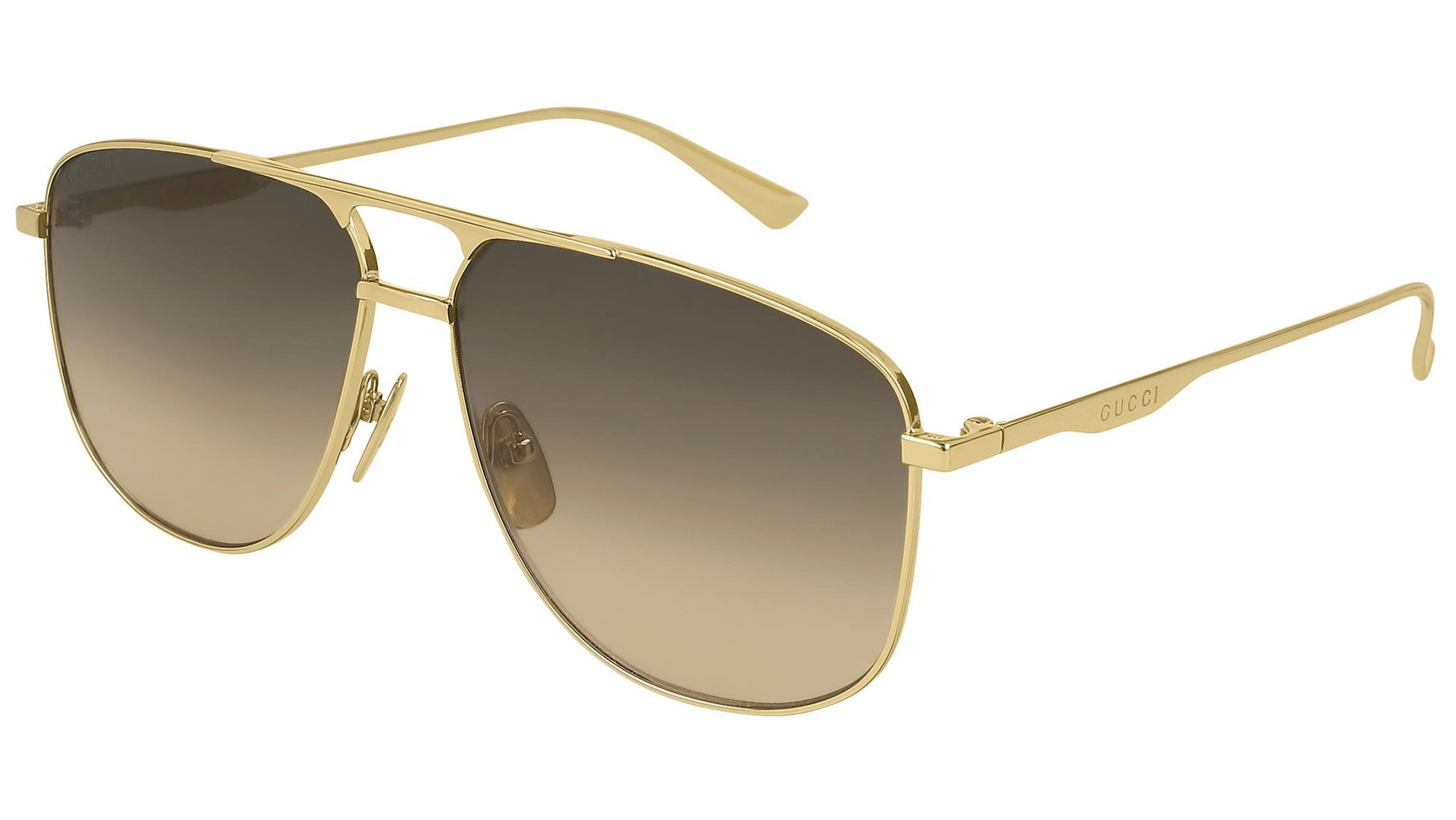 Gucci Logo sunglasses model GG0336S aviator metal frame color code 001 shiny endura gold with gold temple and gradient brown lens.