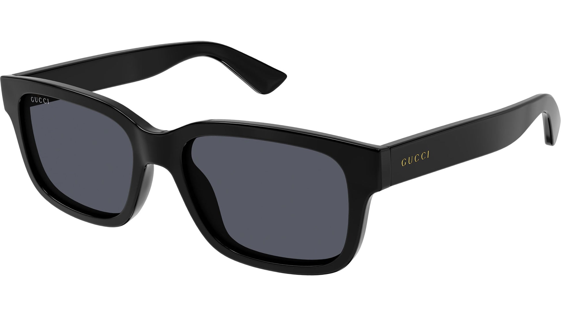 Gucci Lettering sunglasses model GG1583S rectangle injection frame color code 001 shiny black with black temple and solid grey lens.