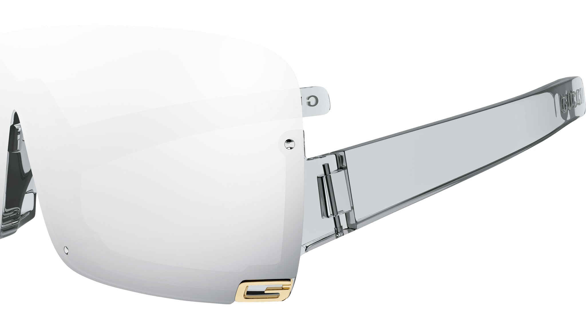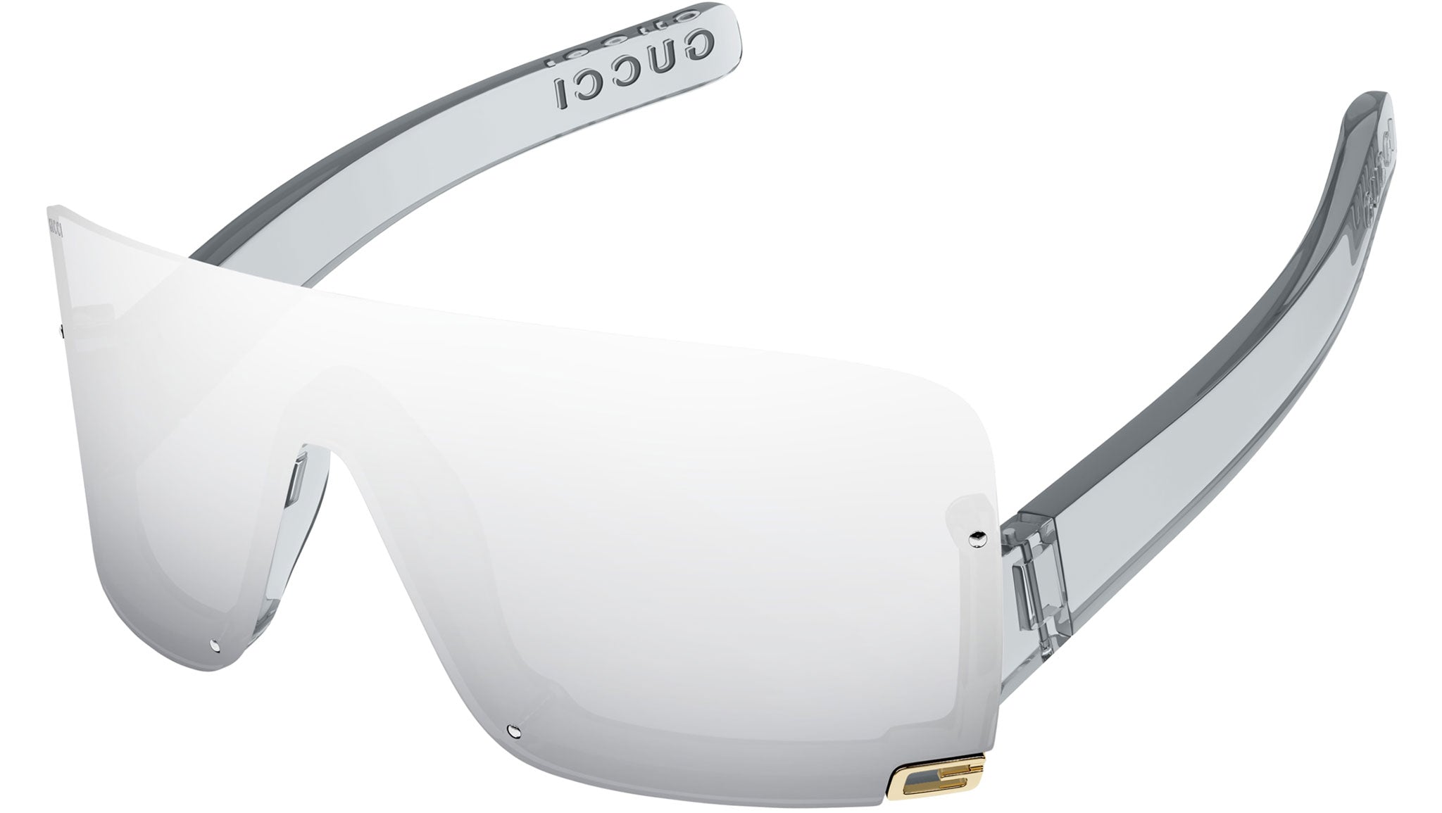 Gucci sunglasses model GG1637S Fashion eyewear collection shield injection frame featuring shiny transparent light grey frame and grey lens.