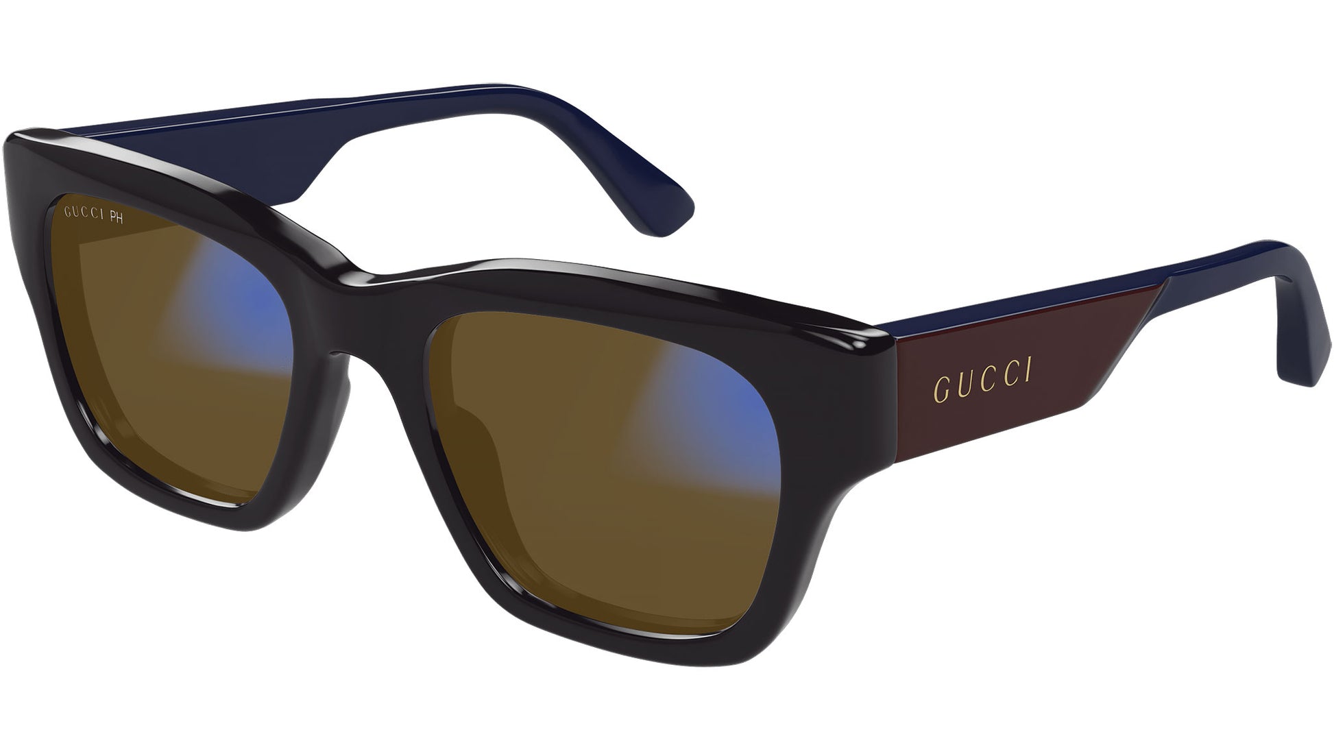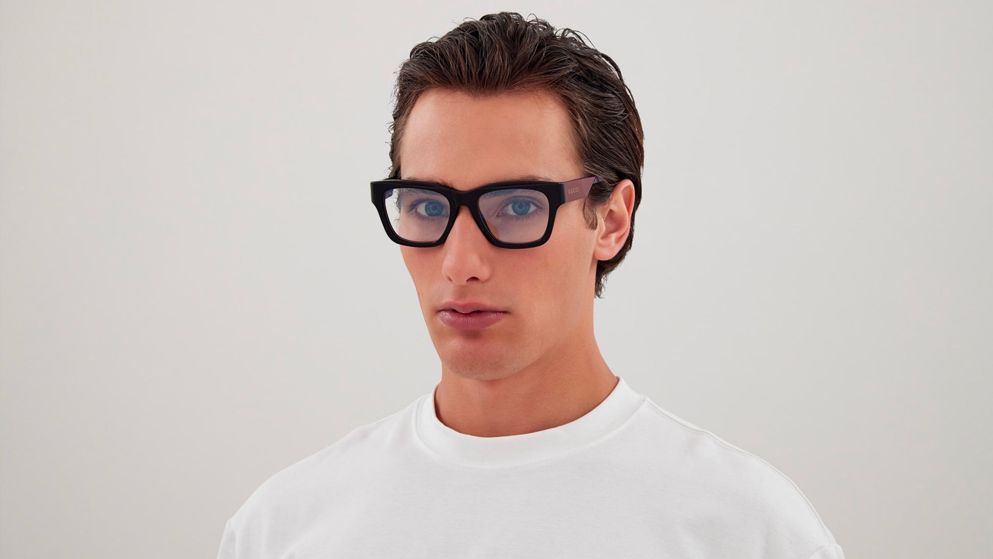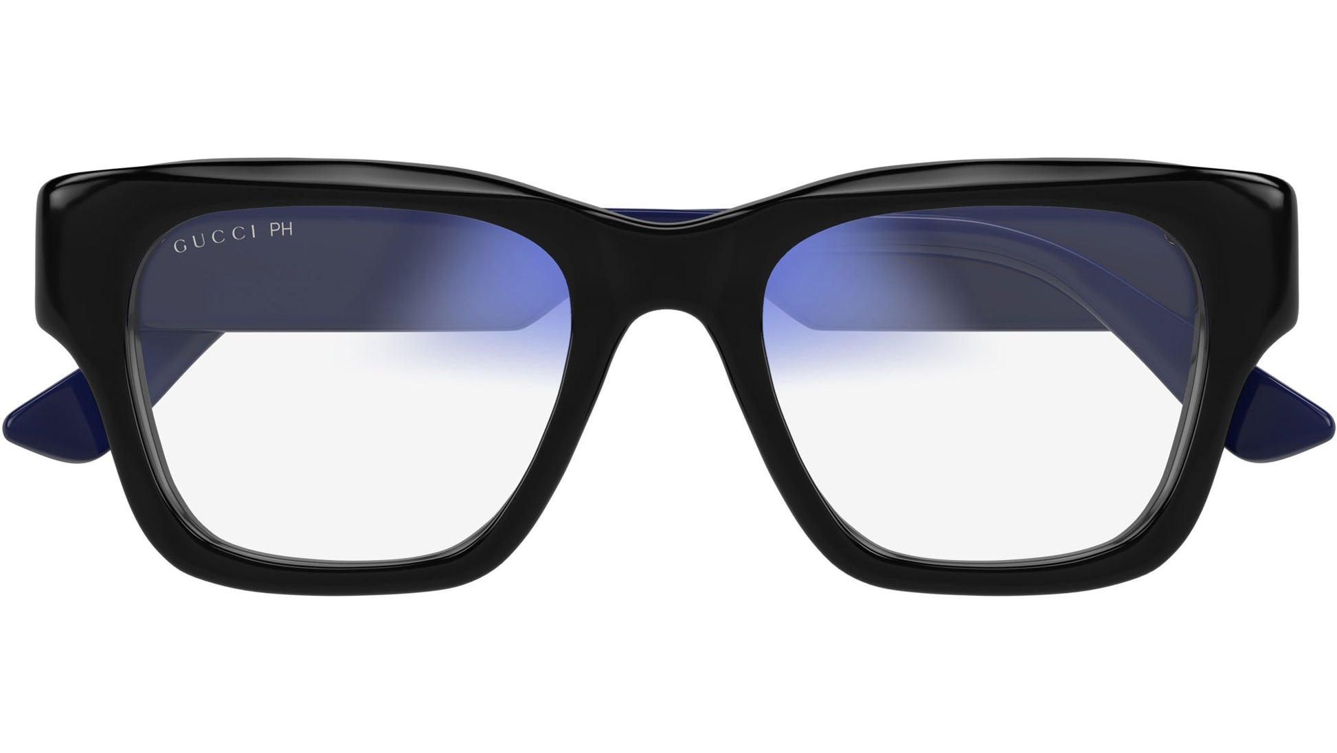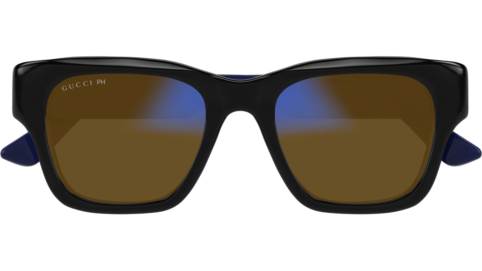 Gucci sunglasses model GG1669S Lettering line rectangle recycled acetate frame color code 001 shiny black with blue temple and clear to nicotine photocromic + AR blue reducer lenses. Authorized Gucci online reseller. Your glasses will come with the original case and accessories and will be covered by a 12-month global warranty.