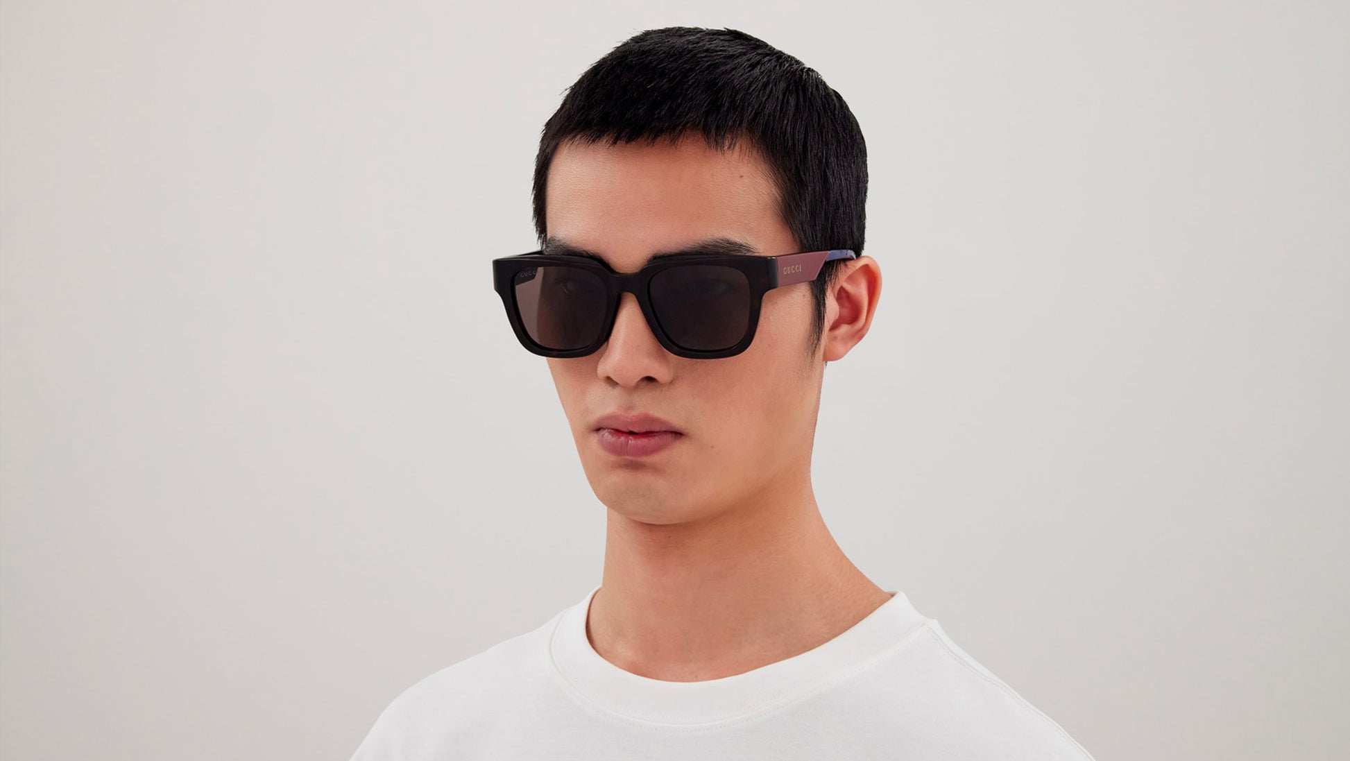 Gucci sunglasses model GG1670SK Lettering line rectangle recycled acetate frame color code 002 shiny dark havana with blue temple and solid gray lenses. Authorized Gucci online reseller. Your glasses will come with the original case and accessories and will be covered by a 12-month global warranty.