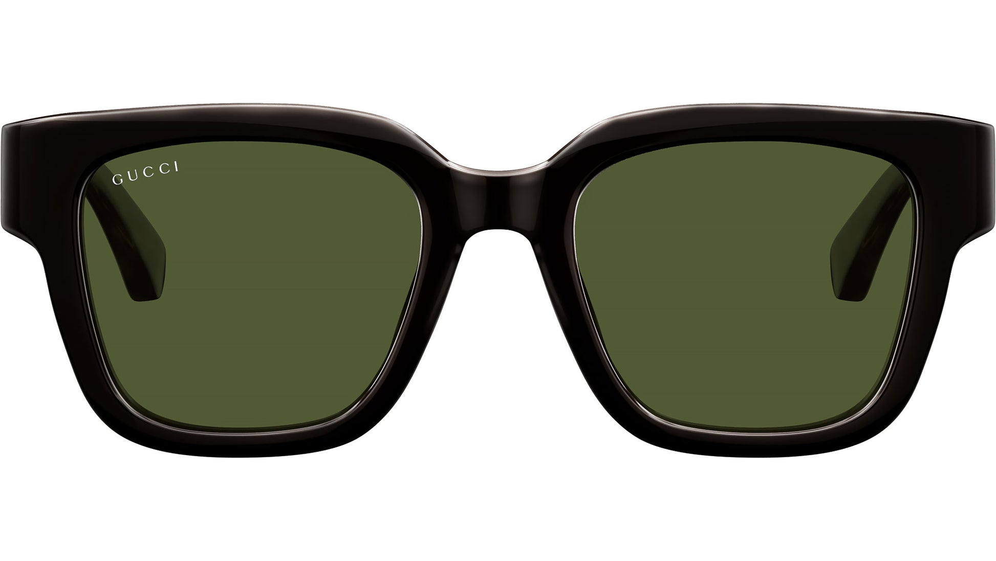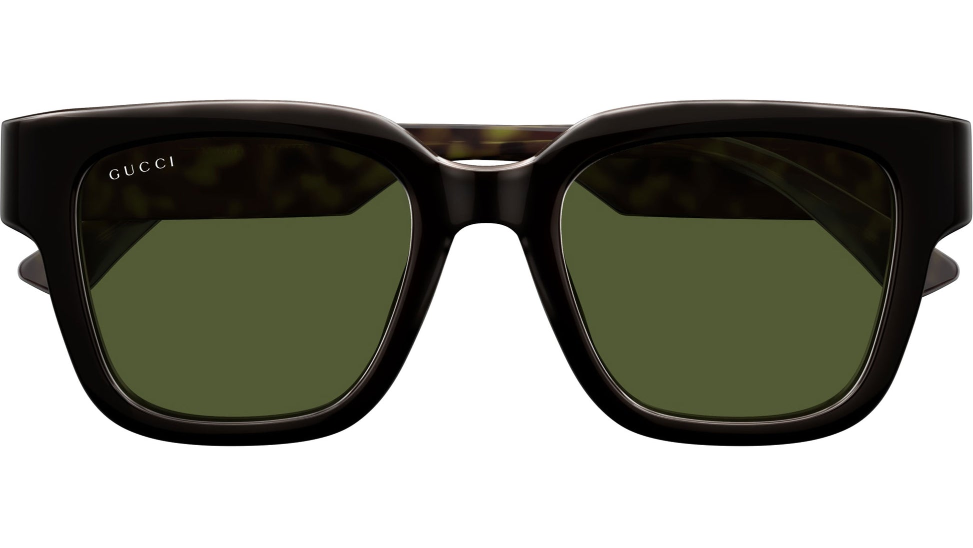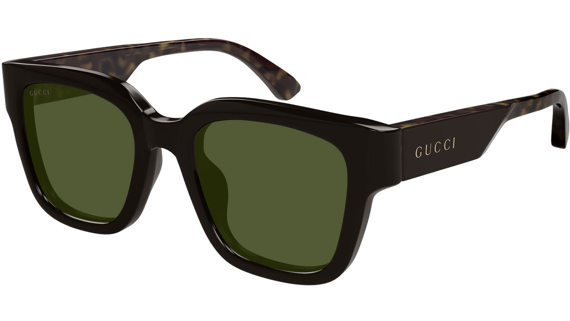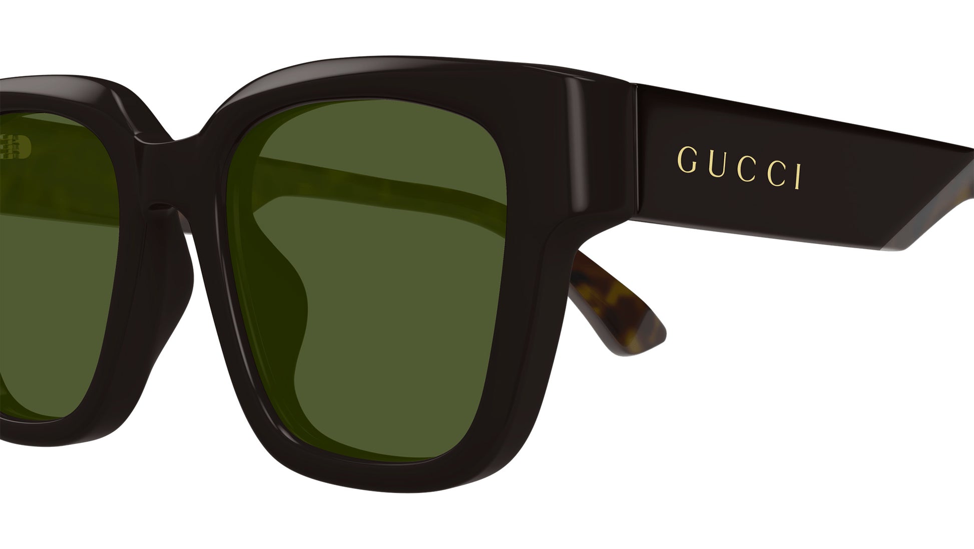 Gucci sunglasses model GG1670SK Lettering line rectangle recycled acetate frame color code 003 shiny solid brown with havana temple and solid green lenses. Authorized Gucci online reseller. Your glasses will come with the original case and accessories and will be covered by a 12-month global warranty.