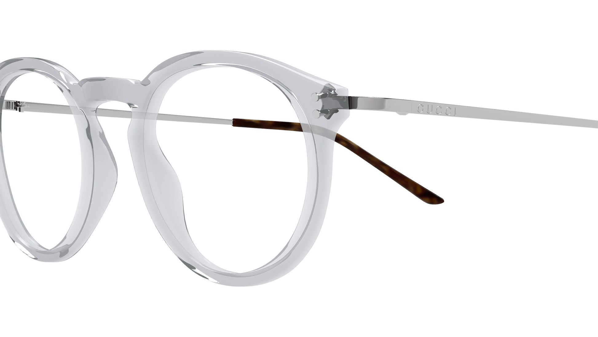 Gucci eyewear model GG1710O Lettering line panthos recycled acetate frame color code 003 shiny transparent cloudy grey with silver temple and demo lens. Authorized Gucci online reseller. Your glasses will come with the original case and accessories and will be covered by a 12-month global warranty.