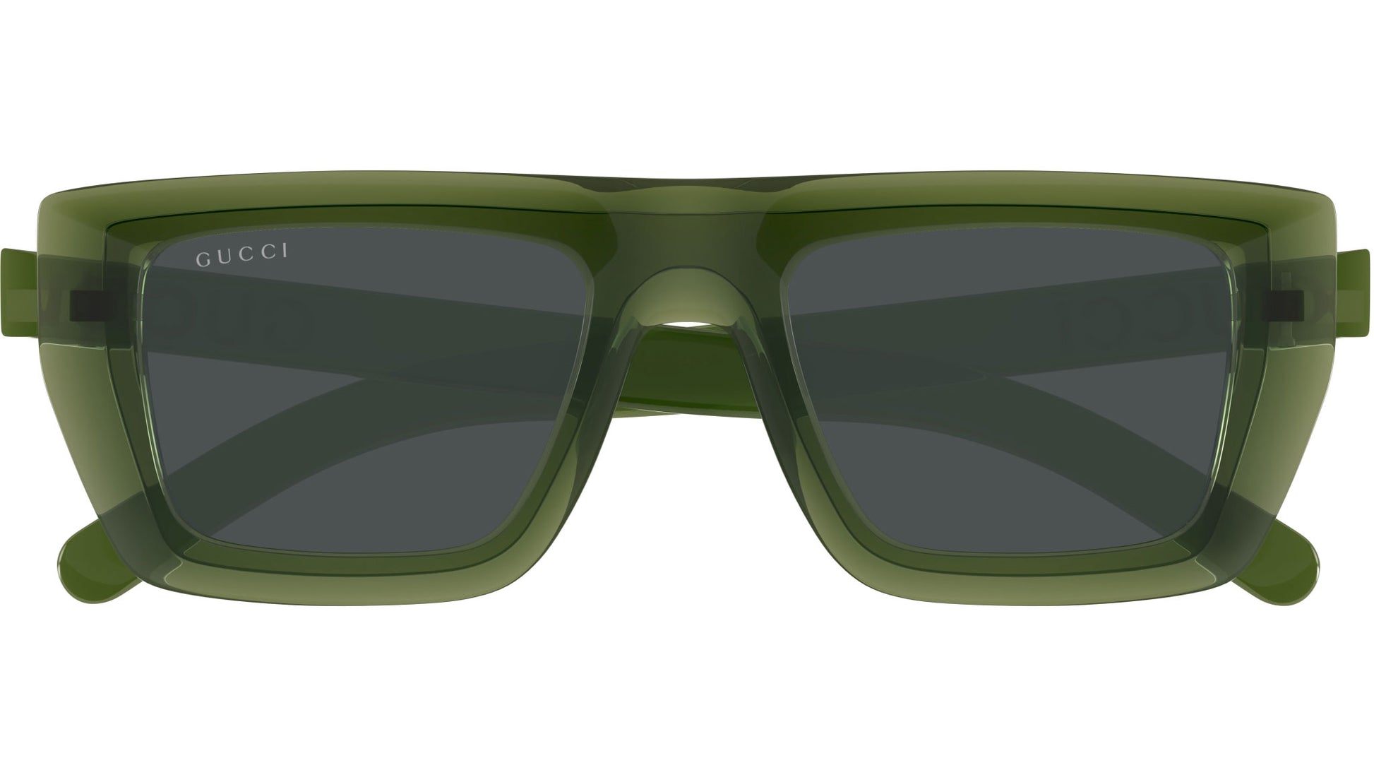 Gucci sunglasses model GG1723S Lettering line rectangle injection frame color code 004 front: shiny transparent dark green - front edge allover: shiny transparent cloudy grey with green temple and solid smoke lenses. Authorized Gucci online reseller. Your glasses will come with the original case and accessories and will be covered by a 12-month global warranty.