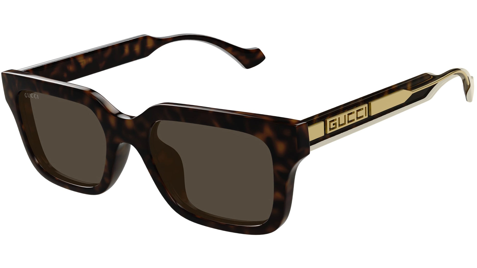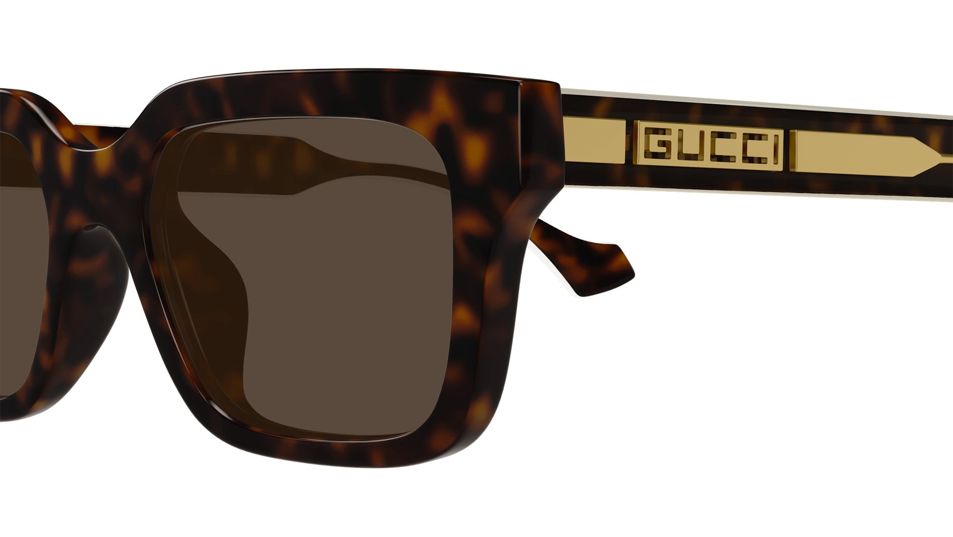 Gucci sunglasses model GG1732SK Lettering line rectangle injection frame color code 002 shiny dark havana with yellow temple and solid brown lenses. Authorized Gucci online reseller. Your glasses will come with the original case and accessories and will be covered by a 12-month global warranty.